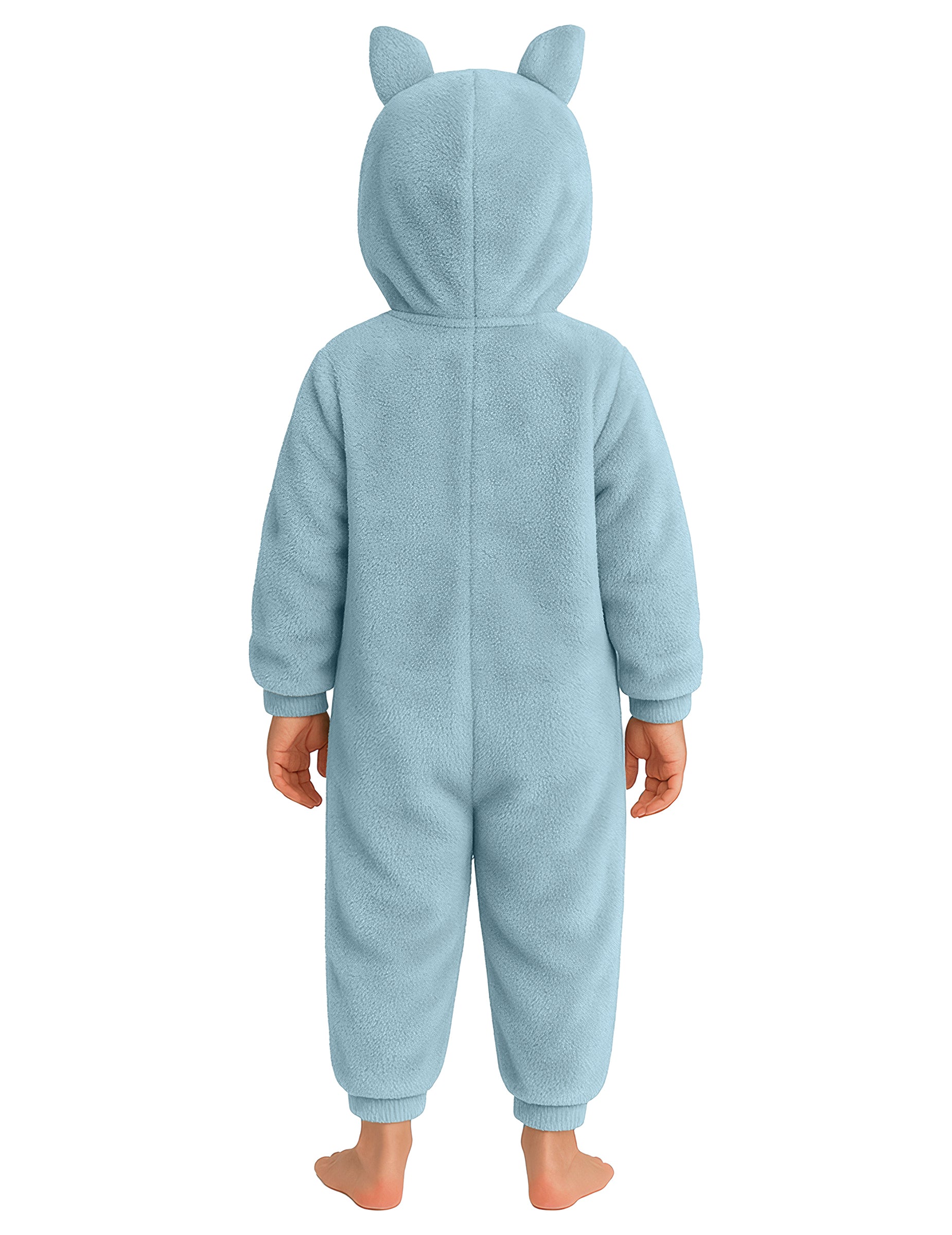 A világoskék, puha és bolyhos plüss anyagból készült kezeslábas melegen tartja gyermekét, miközben szabad mozgást biztosít számára. A füllel és vidám arccal díszített kapucni mókás és bájos hangulatot kölcsönöz. Az elöl gombos záródásnak köszönhetően ez a jelmez könnyen felvehető és kényelmes viselet.