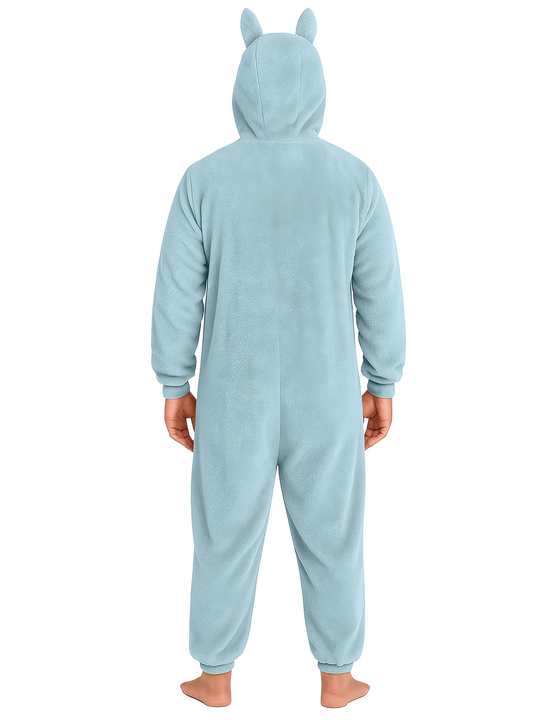 A világoskék plüss anyagból készült kezeslábas olyan puha, mint egy takaró, tökéletes választás, ha melegen szeretnél maradni jelmezben. A nagy fülekkel és kifejező arccal ellátott kapucni játékos és vidám hangulatot kölcsönöz. Az elülső gombok egyszerű és gyors öltözködést tesznek lehetővé.