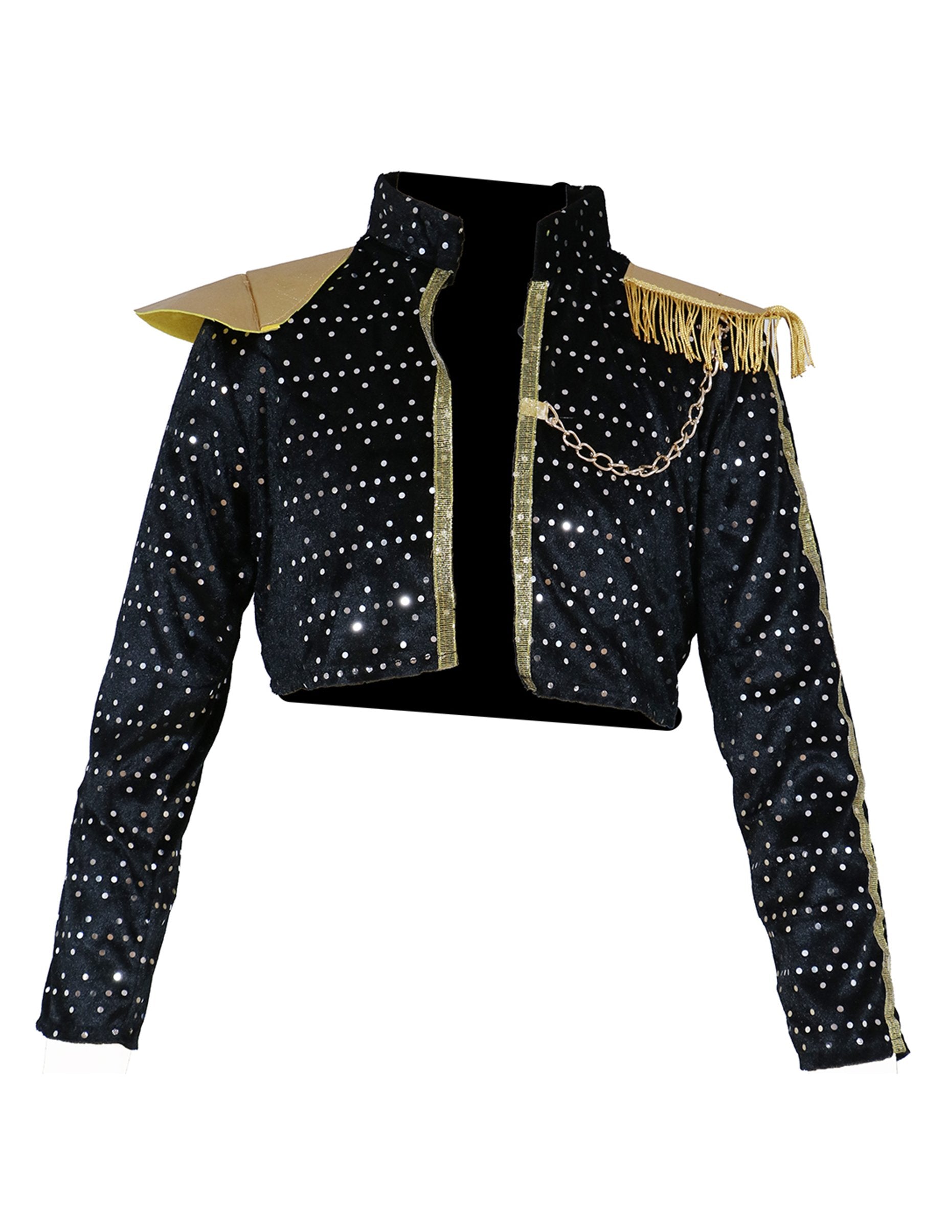 A fekete kabátot nyomtatott flitterek díszítik. Arany színű váll-lapokkal és lánccal díszítik. A díszítőelemek közvetlenül a kabátra vannak varrva.