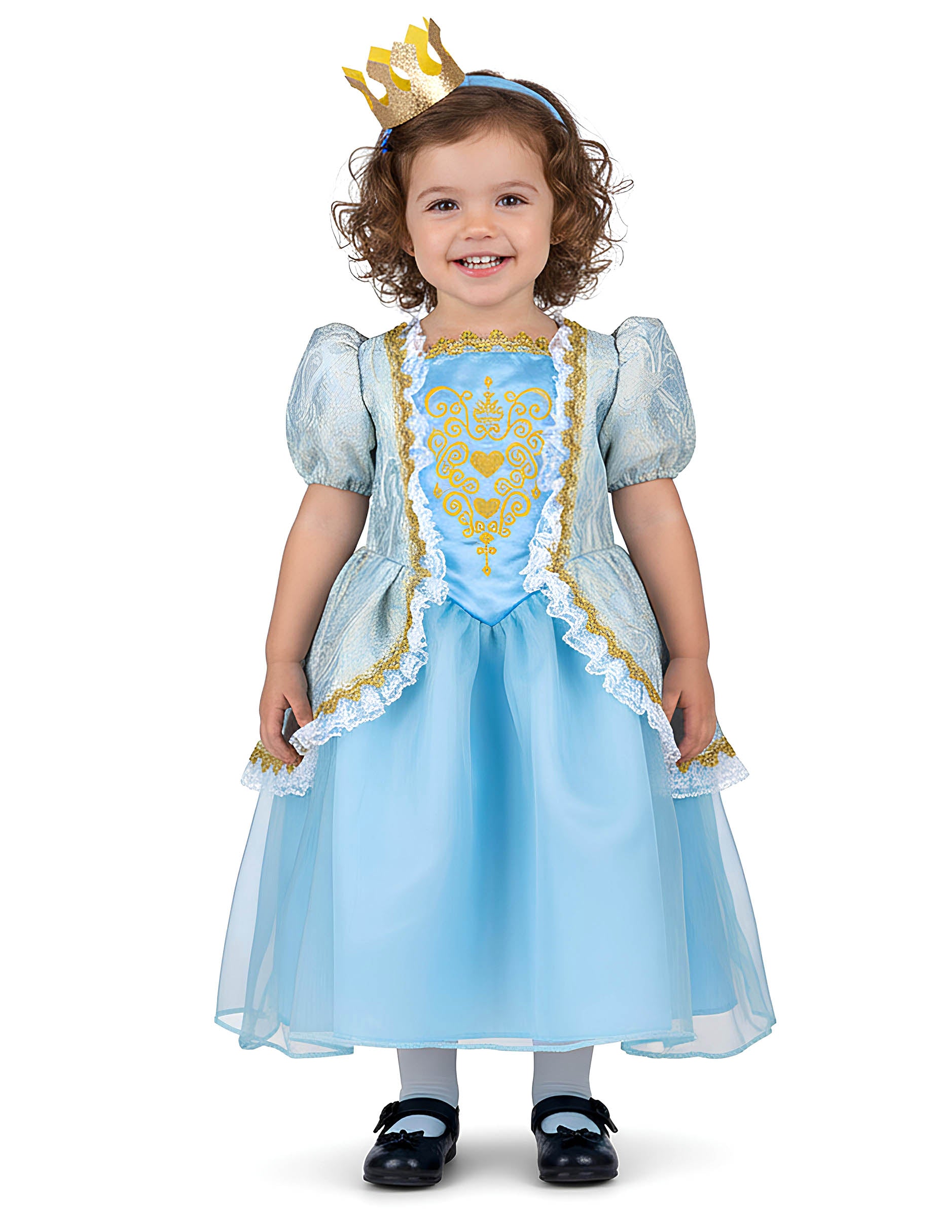 A kék ruha finom arany díszítésekkel idézi egy igazi királyi örökösnő kecsességét és nemességét. A légies alsószoknya szép tartást ad, míg az arany koronával díszített fejpánt igazi királyi megjelenést kölcsönöz, amely minden tekintetet magára von.