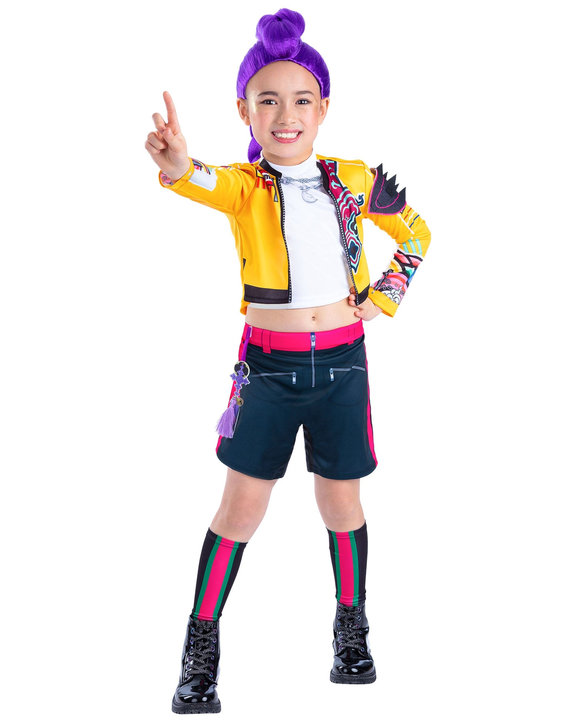 Ez a Rumi Kpop Demon Hunter™ lány jelmez egy ultra-divatos sárga dzsekit, kontrasztos fekete rövidnadrágot és hozzáillő lábszárvédőket tartalmaz, hogy tökéletesen visszaadja a hősnő ikonikus megjelenését.