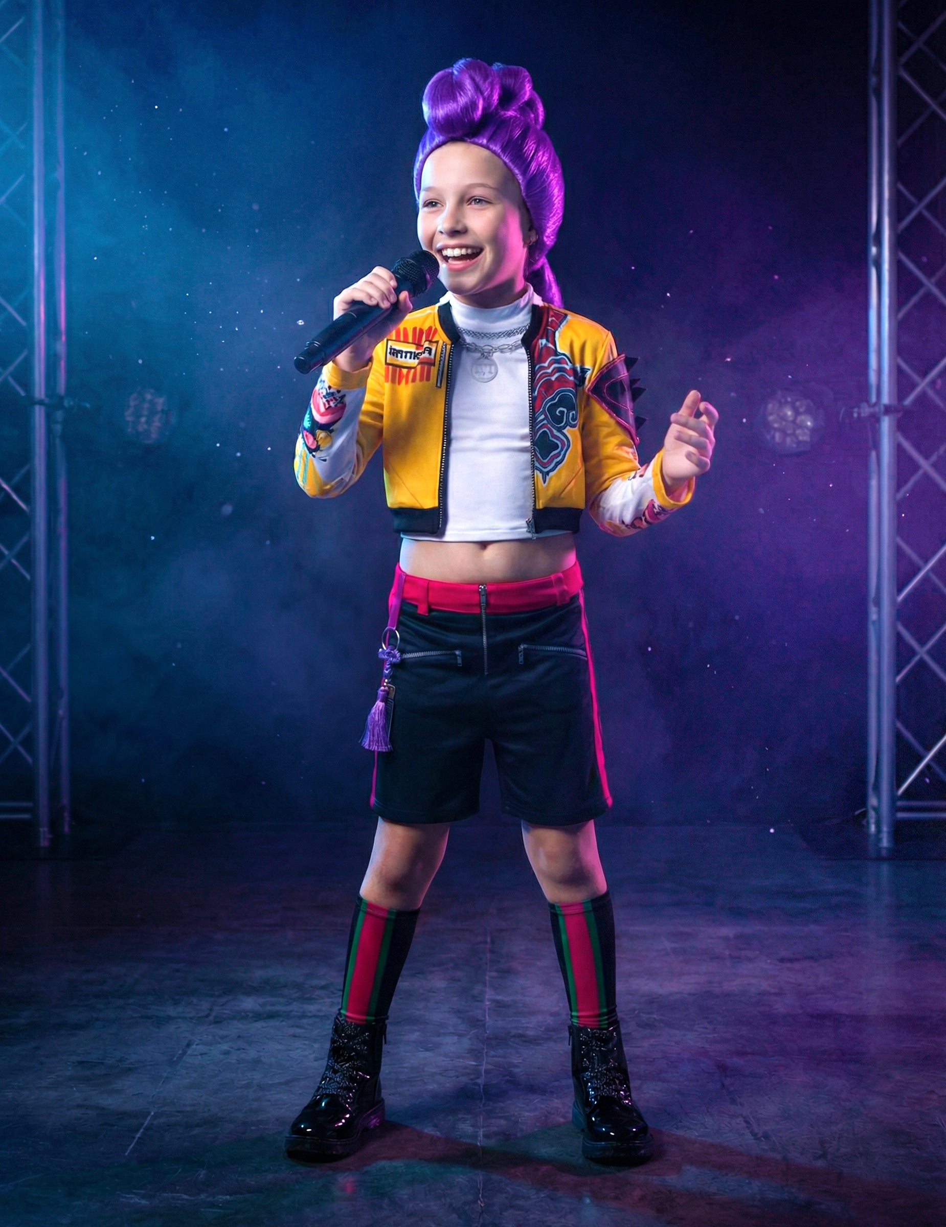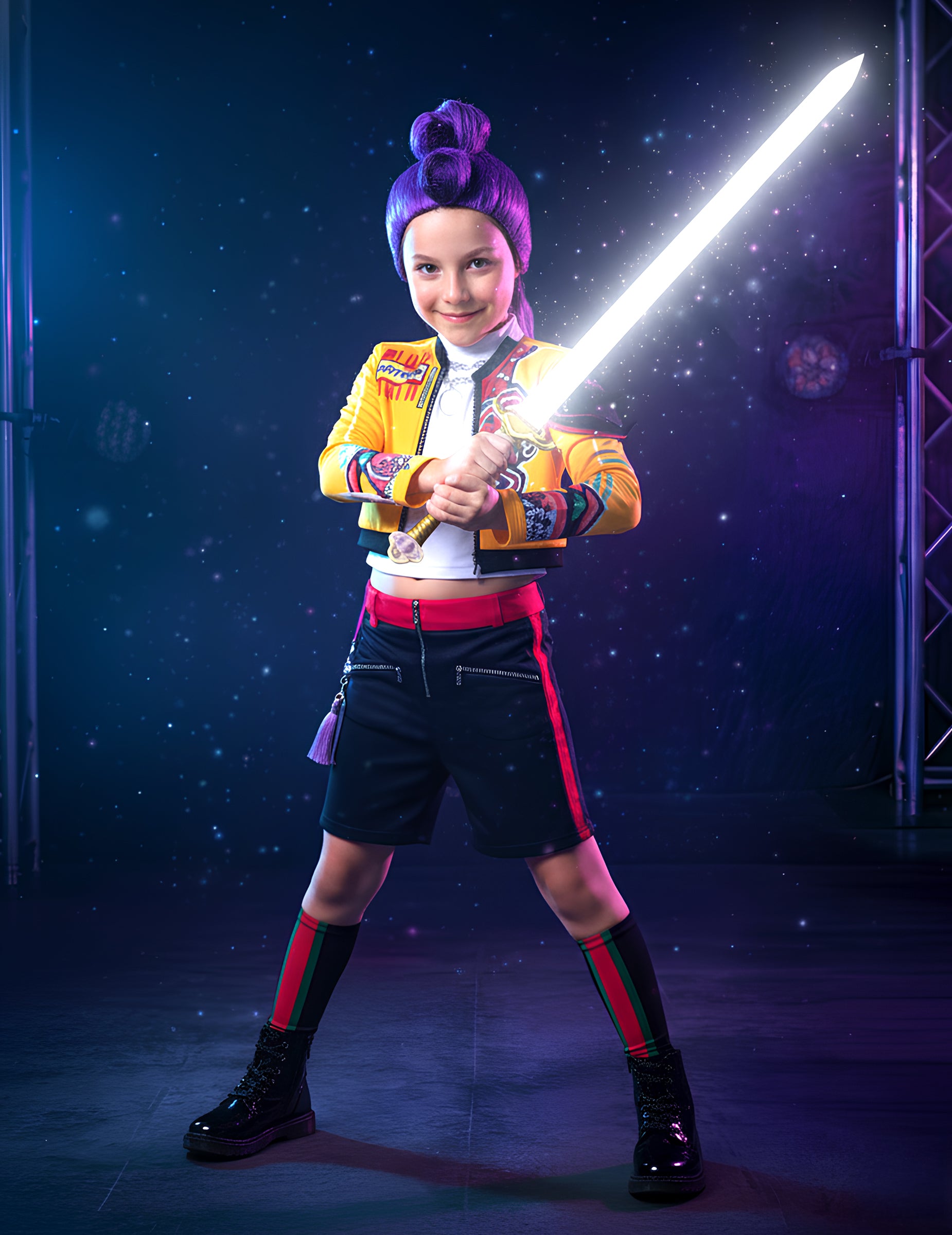 A színes grafikai elemekkel díszített dzseki, amelyet egy „démon” vállrész tesz különlegessé, merész megjelenést kölcsönöz, míg a gumis derekú rövidnadrág kényelmet és stabil tartást biztosít tánchoz, játékhoz vagy felvonuláshoz. A rózsaszín és zöld csíkos lábszárvédők ellenállhatatlan pop hangulatot adnak, tökéletesen illeszkedve a K-pop stílushoz. Könnyű, kellemes anyagokból készült ez a jelmez élénk színeket, nyomott mintákat és igényes kidolgozást ötvöz.