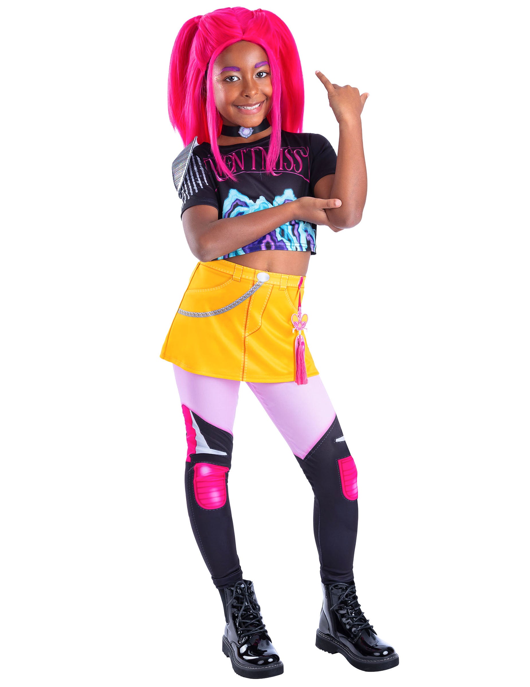 Az energikus kialakítású rövid felső rockos hangulatot kölcsönöz, míg a fényes szoknya és a dekoratív medál mozgást és modernséget ad a jelmezhez. A rózsaszín, fehér és fekete árnyalatú leggings kényelmet és szabad mozgást biztosít – tökéletes táncoláshoz vagy órákon át tartó játékhoz. Puha, rugalmas anyagból készült, ez a jelmez élénk színeket, minőségi nyomatokat és igényes kidolgozást ötvöz a látványos összhatásért.