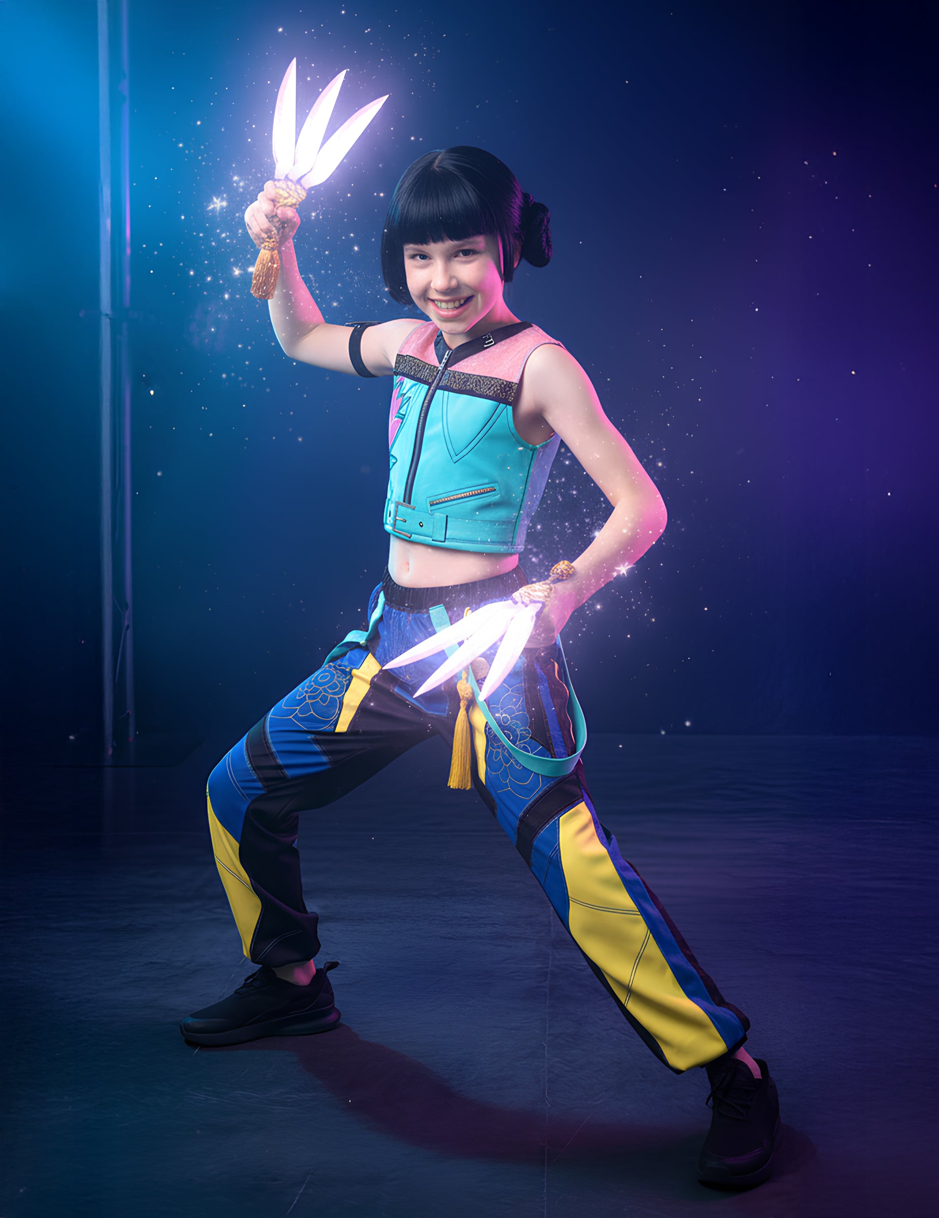 A Zoey Kpop Demon Hunter™ lány jelmez egy türkiz színű, rövid felsőből áll, amelyet grafikus minták díszítenek, valamint egy bő, színes nadrágból, amely az ikonikus hősnő streetwear öltözékét idézi.