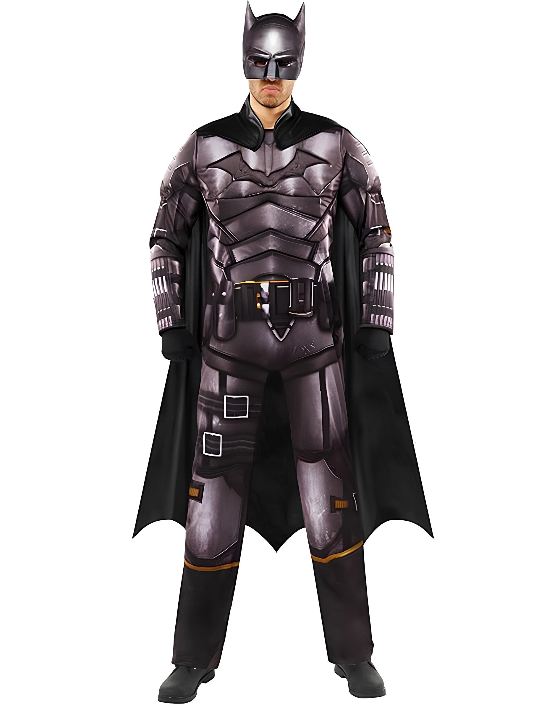 Ez a luxus férfi Batman jelmez lenyűgöző megjelenést kölcsönöz a hős felszerelésére emlékeztető részletes páncélzattal ellátott, mintás overalljának. Sötét színe és fémes felületei erőteljes és hiteles megjelenést kölcsönöznek. A lenge köpeny mozgást kölcsönöz a ruhának, a hozzá illő maszk pedig teljessé teszi a Sötét Lovag titokzatos megjelenését. Tökéletes jelmez a híres igazságosztó megtestesítésére egy jelmezes partin vagy hősies eseményen.