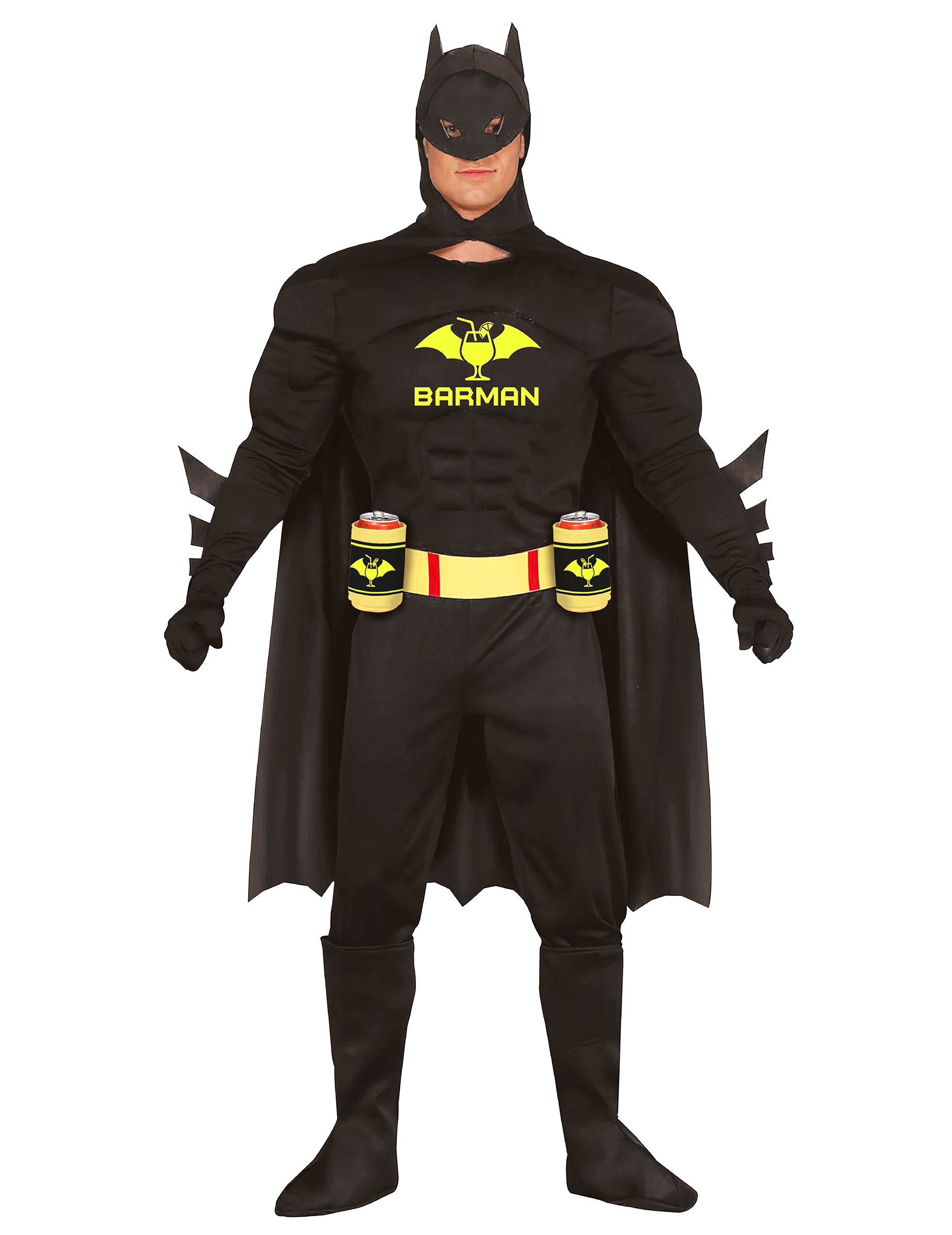 Ez a felnőtt csapos jelmez a maszkos hőst a buli királyává változtatja. A fekete, izomzatos overált a sárga Bártender logó díszíti, amely mókás utalás humoros megfelelőjére. Lengő köpenye, pohártartós öve és a hozzá illő maszk teszi teljessé ezt az eredeti és ünnepi megjelenést. Kényelmes és könnyen viselhető, a stílust és a humort ötvözi, hogy a pillanat sztárjává varázsoljon. Tökéletes jelmez jelmezes bulira, karneválra vagy legénybúcsúra.