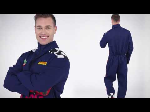 Ez a felnőtt autóversenyző jelmez igazi pályabajnokká varázsol. A teljes sötétkék overál szponzor stílusú nyomtatott részletekkel, Racing logóval és kockás mintákkal van díszítve a vállakon és bokákon, amelyek a versenyek célzászlóira emlékeztetnek.