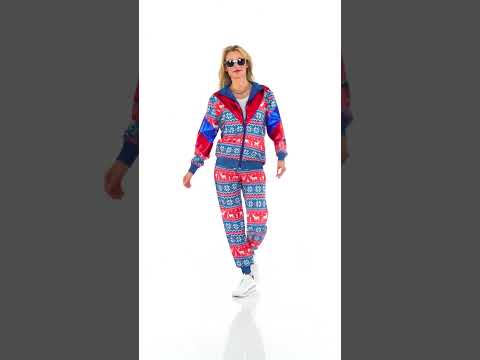 Ez a kék és piros karácsonyi tréningruha jelmez felnőtteknek egyedi és ünnepi megjelenést kölcsönöz. A szett egy cipzáras dzsekit és egy hozzáillő nadrágot tartalmaz, amelyeket rénszarvasos, hópelyhes és fenyőfás minták díszítenek, újragondolt karácsonyi pulóver stílusban.