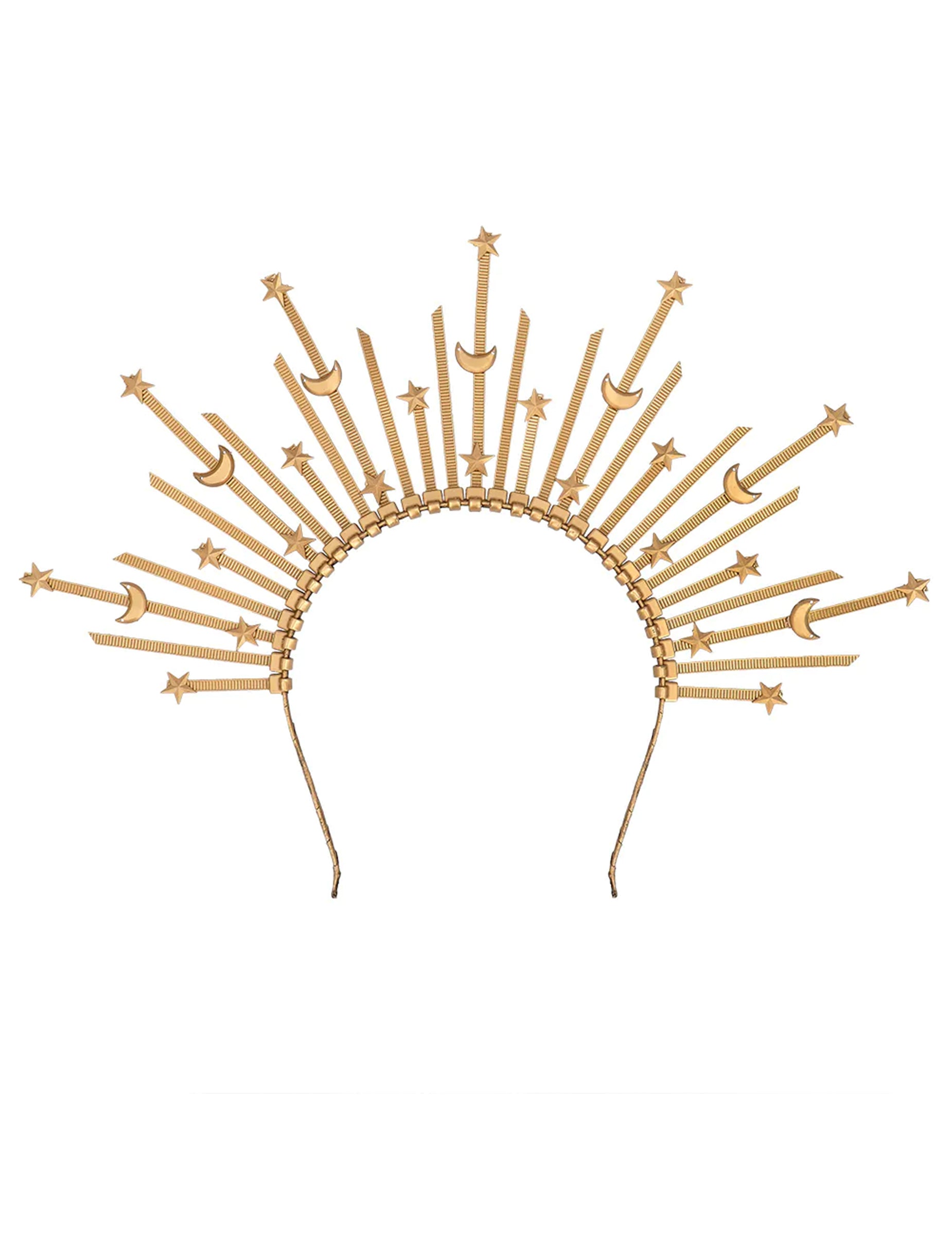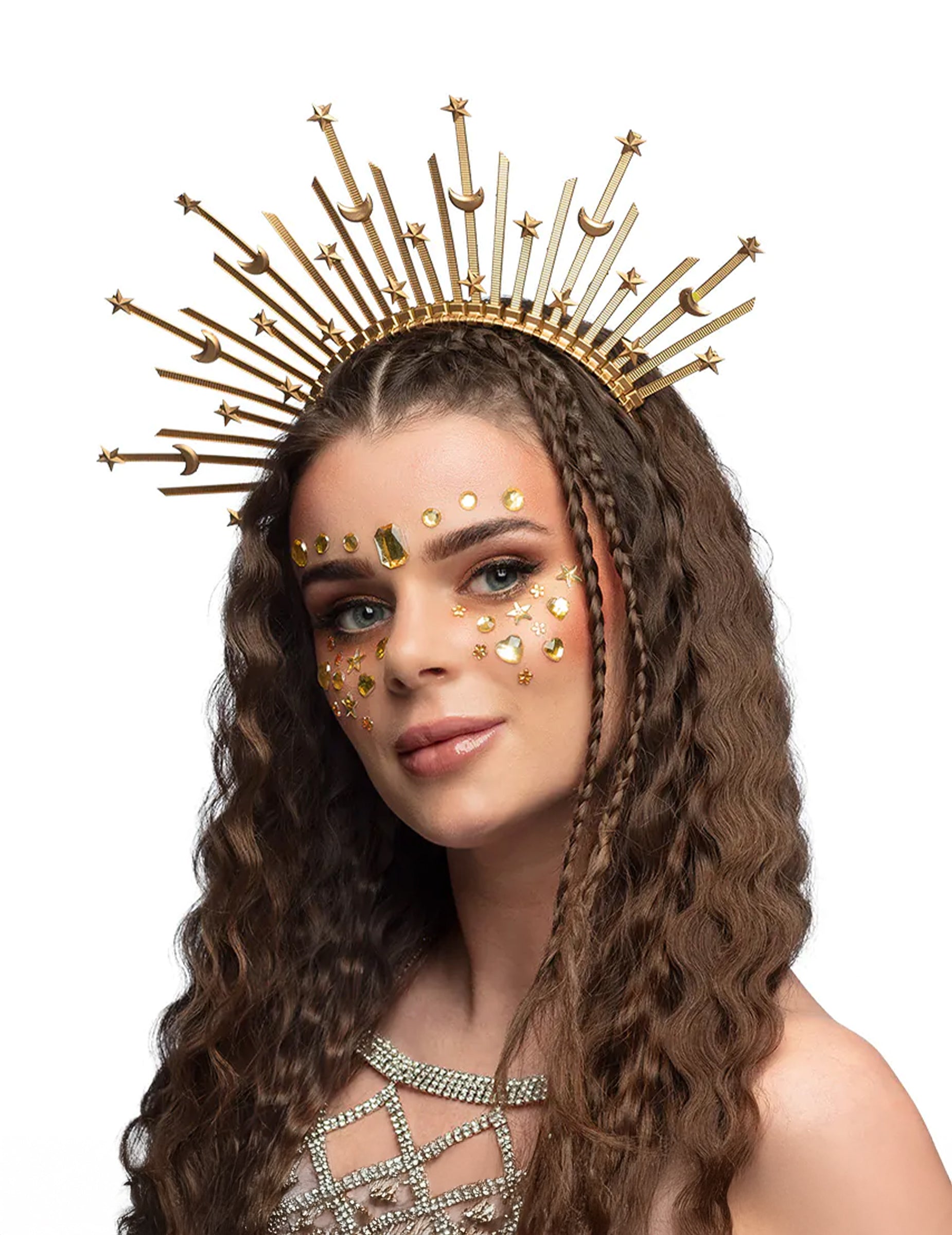 Ez a felnőtteknek szánt, csillaggal és holddal díszített glóriás fejpánt misztikus és elegáns kiegészítője lehet öltözékednek. Arany színű, csillagokkal és holdsarlókkal díszített sugarakból áll, amelyek kifinomult glóriát alkotnak a fej körül. Könnyű és kényelmes, így könnyen viselhető fesztiválokon, jelmezbálokon vagy mesés eseményeken, és tökéletesen kiegészíti egy angyal, istennő vagy égitest jelmezét.