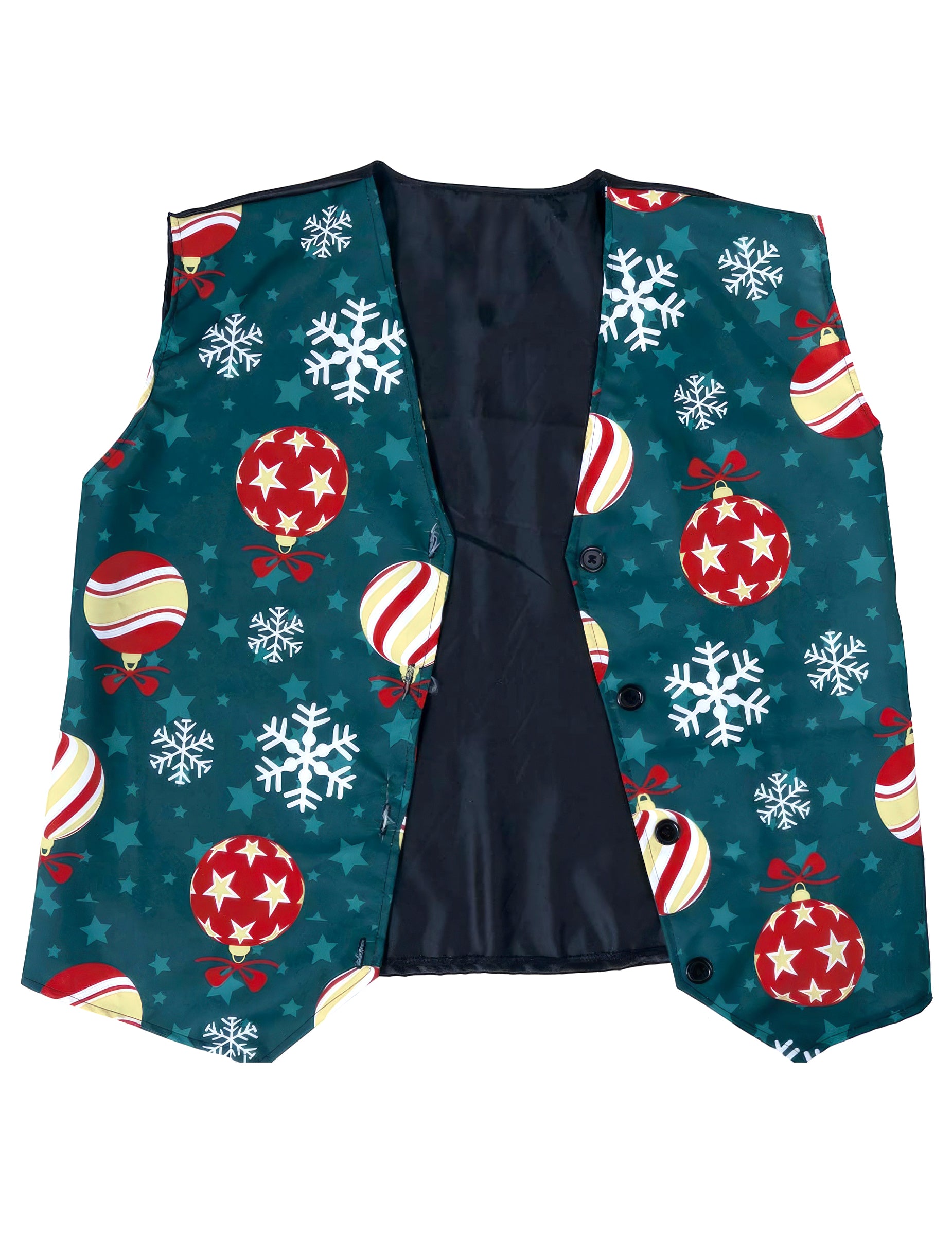 Ez a hópelyhes és karácsonyi gömbös mellény felnőtteknek eredeti és kifinomult stílust kölcsönöz. A mélyzöld alapon fehér hópelyhek, valamint piros és arany gömbök keverednek vidám, színes mintában, tökéletesen illeszkedve az ünnepi varázshoz.