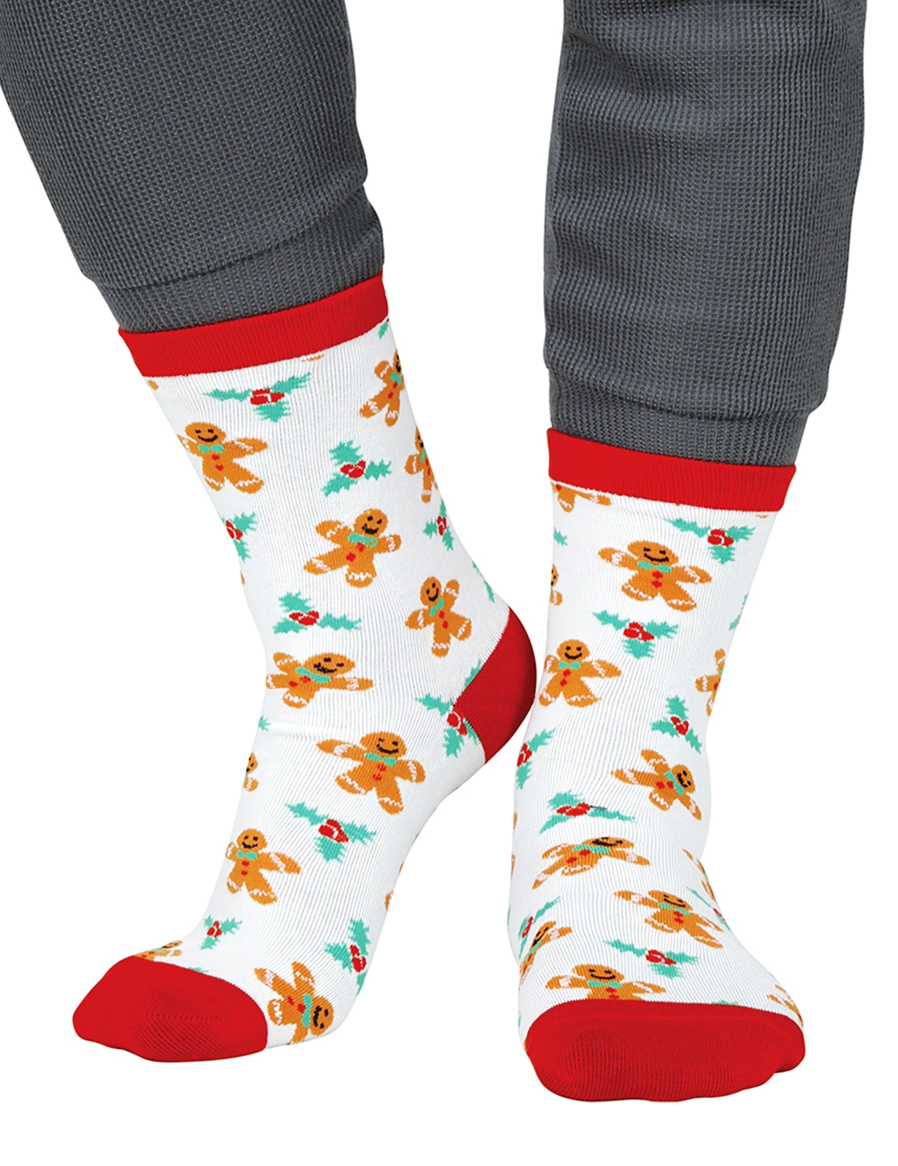 Ezek a fehér, mézeskalács mintás karácsonyi zoknik felnőtteknek meleg és édes hangulatot kölcsönöznek az öltözékednek. Az imádnivaló kis mézeskalács figurák, magyallevelekkel körülvéve, ismétlődnek a világos háttér előtt, felidézve az ünnepek örömteli és megnyugtató szellemét. Piros szegélyük, sarkaik és lábujjaik élénk és ünnepi hangulatot kölcsönöznek, tökéletesek egy vidám, ünnepi megjelenés kiegészítéséhez.