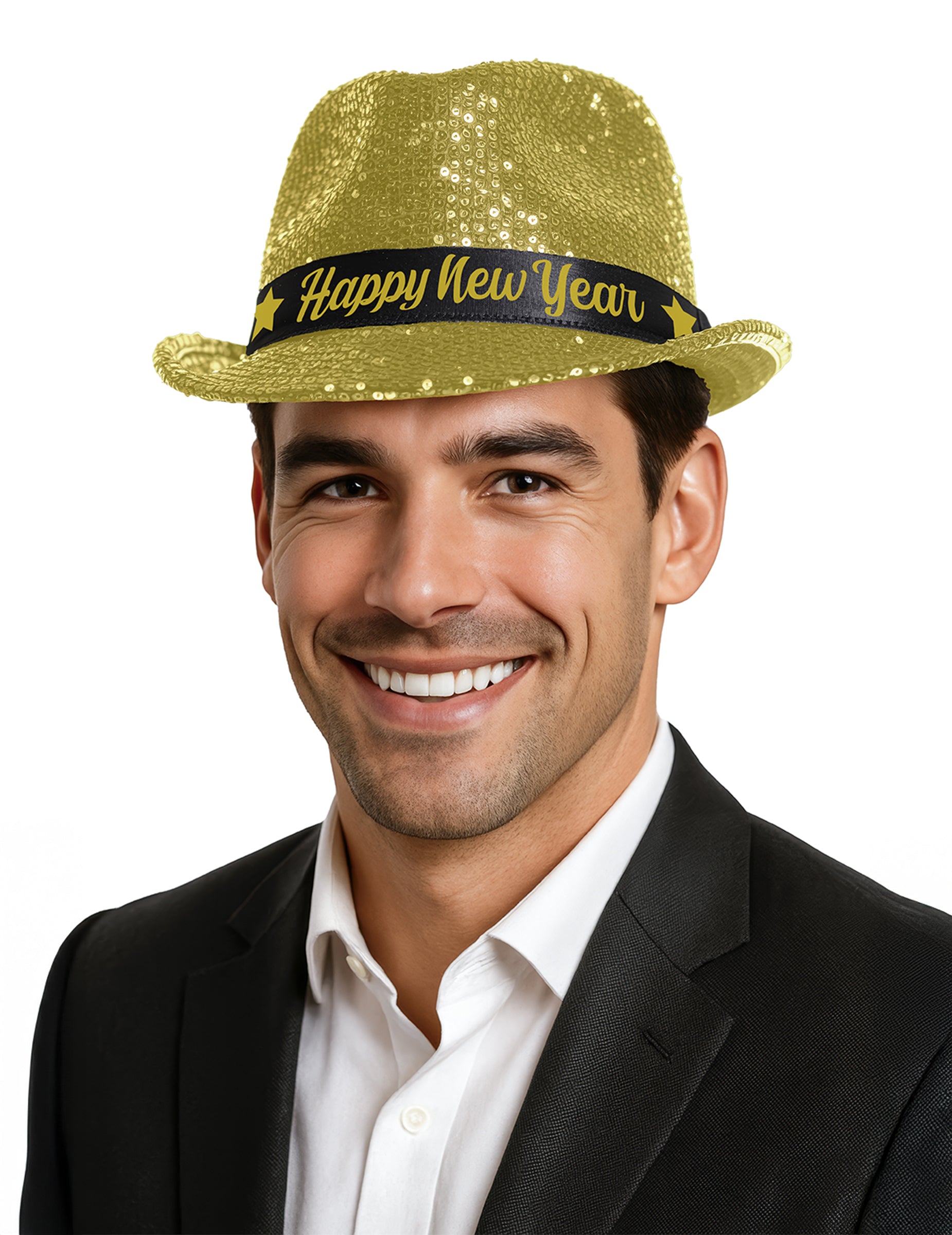 Ez az arany flitteres kalap a tökéletes kiegészítő, hogy stílusosan ünnepeld az újévet. Egy fekete szalag díszíti, amelyen az áll: “Happy New Year” arany csillagokkal körülvéve, így minden tekintetet magára vonz, és azonnal ünnepi hangulatot kölcsönöz az öltözékednek.