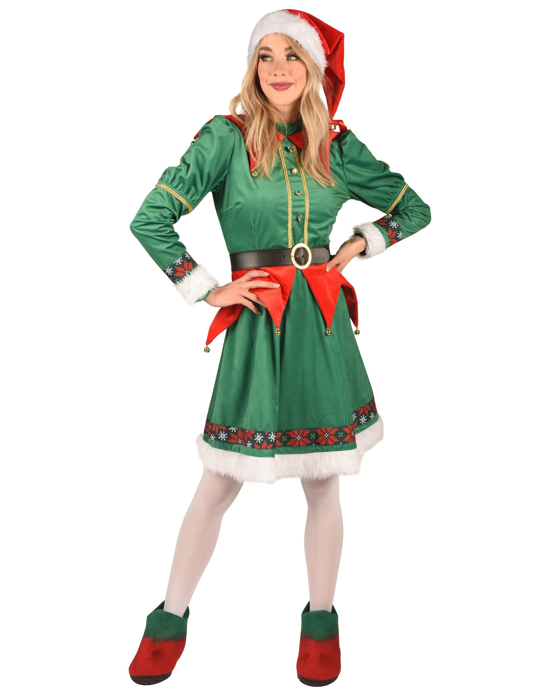 Ez a luxus női karácsonyi manó jelmez egy ünnepi részletekkel díszített zöld ruhaból áll, amelyhez illő kalap és egy díszöv tartozik, amely szépen kiemeli a derekat. A hagyományos színek és a ragyogó részletek valóban varázslatos hangulatot kölcsönöznek, tökéletesen illeszkedve a manók világához.