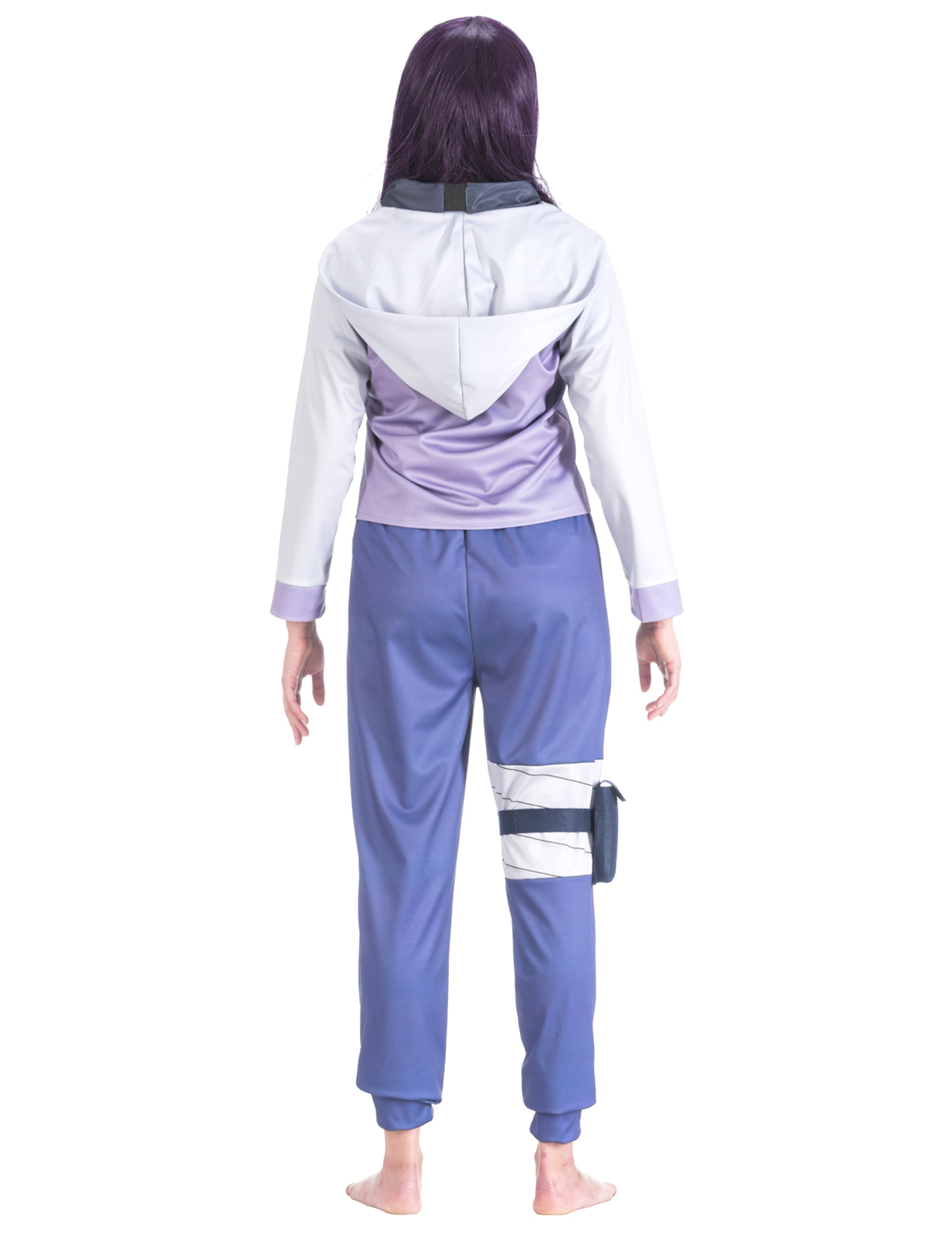 Ez a Hinata Naruto női jelmez tartalmaz egy lila dzsekit, egy sötét felsőt, kék nadrágot, egy nyakláncot és egy tasakot – öt darab, amely tökéletesen visszaadja a karakter megjelenését. A dzseki lágy lila színben pompázik, világos ujjakkal, míg a sötét felső egyszerű kontrasztot alkot. A kék nadrág kényelmes, egyenes szabású. A nyaklánc a falu jól ismert szimbólumát ábrázolja, az tasakot pedig oldalt viselve fokozza Hinata stílusát. Tökéletes jelmez tematikus bulikra, karneválra vagy születésnapra.
