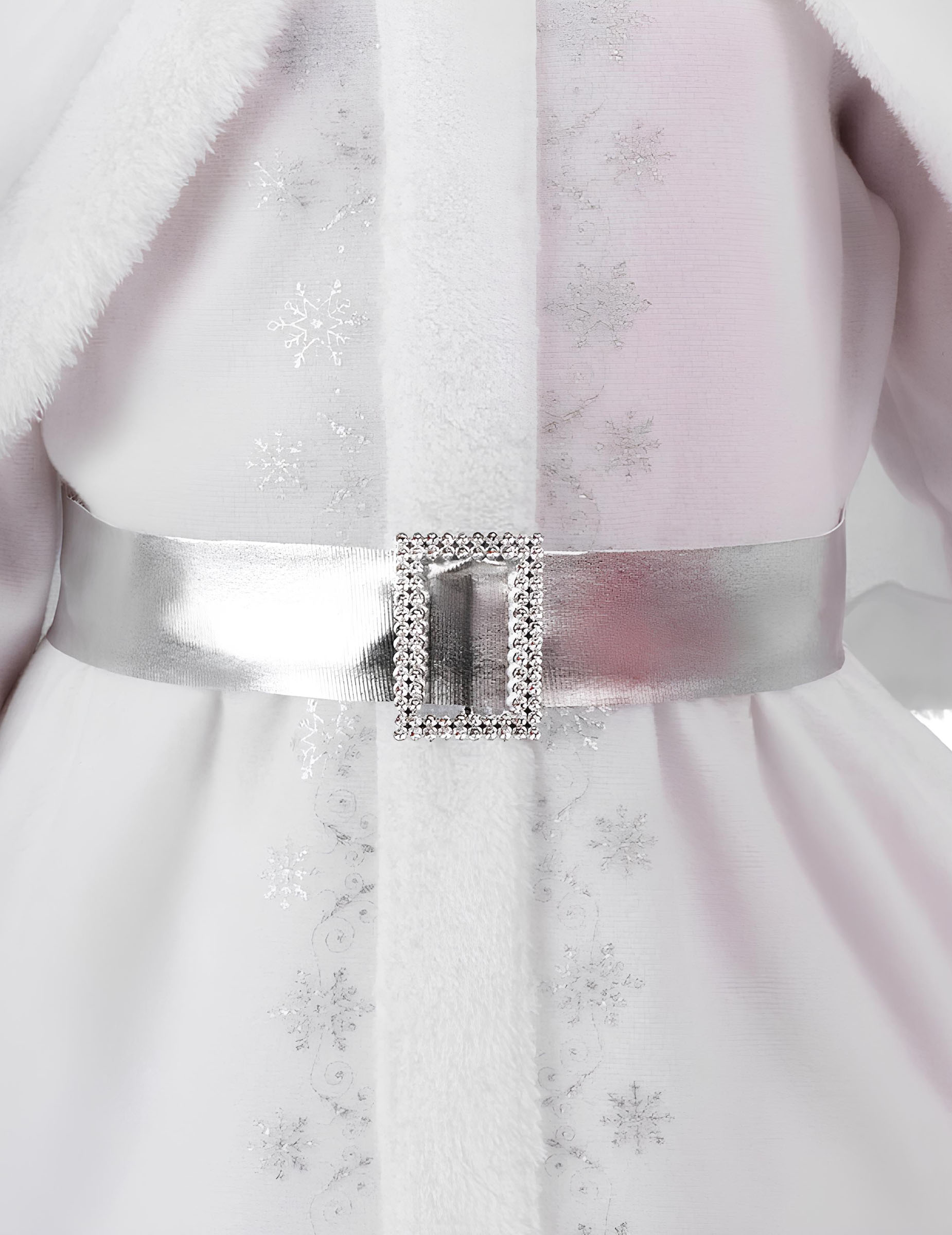 Ez a szett varázslatos hangulatot teremt a karácsonyban elegáns fehér ruhájával és puha, kapucnis köpenyével, amely gyengéden körülöleli a gyermeket. Az összeállítás ragyogó megjelenést kölcsönöz, tökéletes az ünnepek varázsának teljes átéléséhez. Ez a fehér Mikulásné jelmez lányoknak egy ezüst díszítéssel díszített, lenge ruhát és egy csillogó övet ötvöz, amely finoman kiemeli az alakot. A hozzá illő köpeny kifinomult télies hangulatot kölcsönöz, és tökéletesen kiegészíti az ünnepi karácsonyi pillanatokat. Egy szett, amely megmutatja ennek az elvarázsolt évszaknak minden édességét és csillogását.