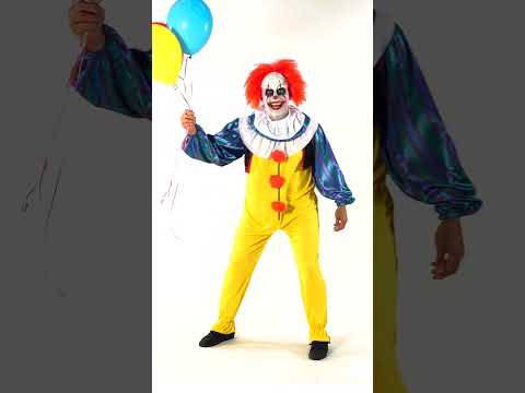 A sárga overál sokszínű csíkos ujjakkal és piros pomponokkal azonnal megteremti a karakter jellegzetes sziluettjét. A grimaszoló arcú maszk a feltűnő vörös hajjal teszi igazán dermesztővé a megjelenést, így valódi horror látvánnyá változtat.