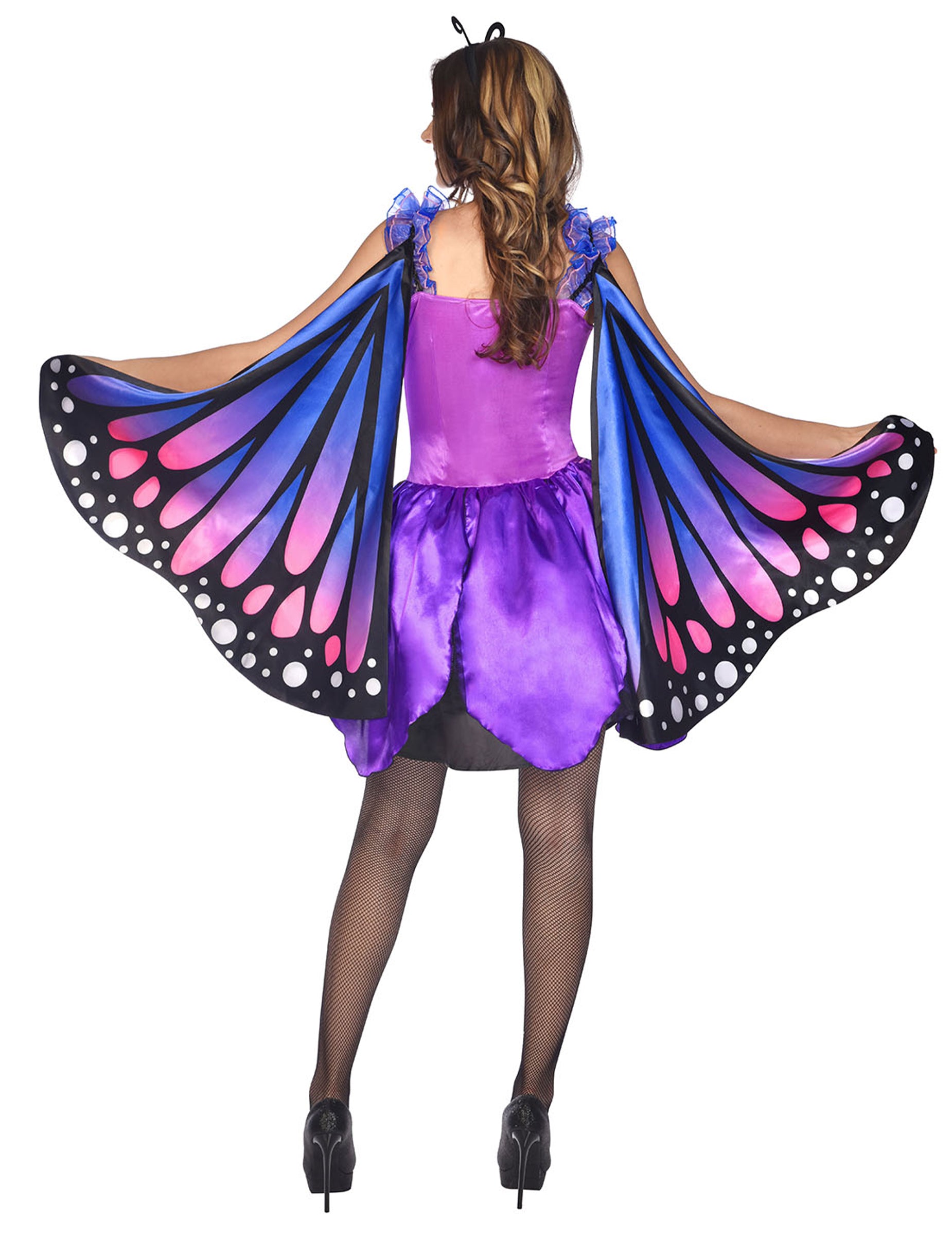 Ez a titokzatos pillangó női jelmez élénk lila, kék és rózsaszín árnyalatú ruhát tartalmaz, éteri és elbűvölő hatást keltve. A karokhoz rögzített, hozzáillő, teljes szárnyak egy egyszerű fedéllel bontakoznak ki, könnyed és világító sziluettet alkotva. Tökéletes viselet, ami magára vonzza a tekinteteket egy jelmezbálon vagy karneválon.