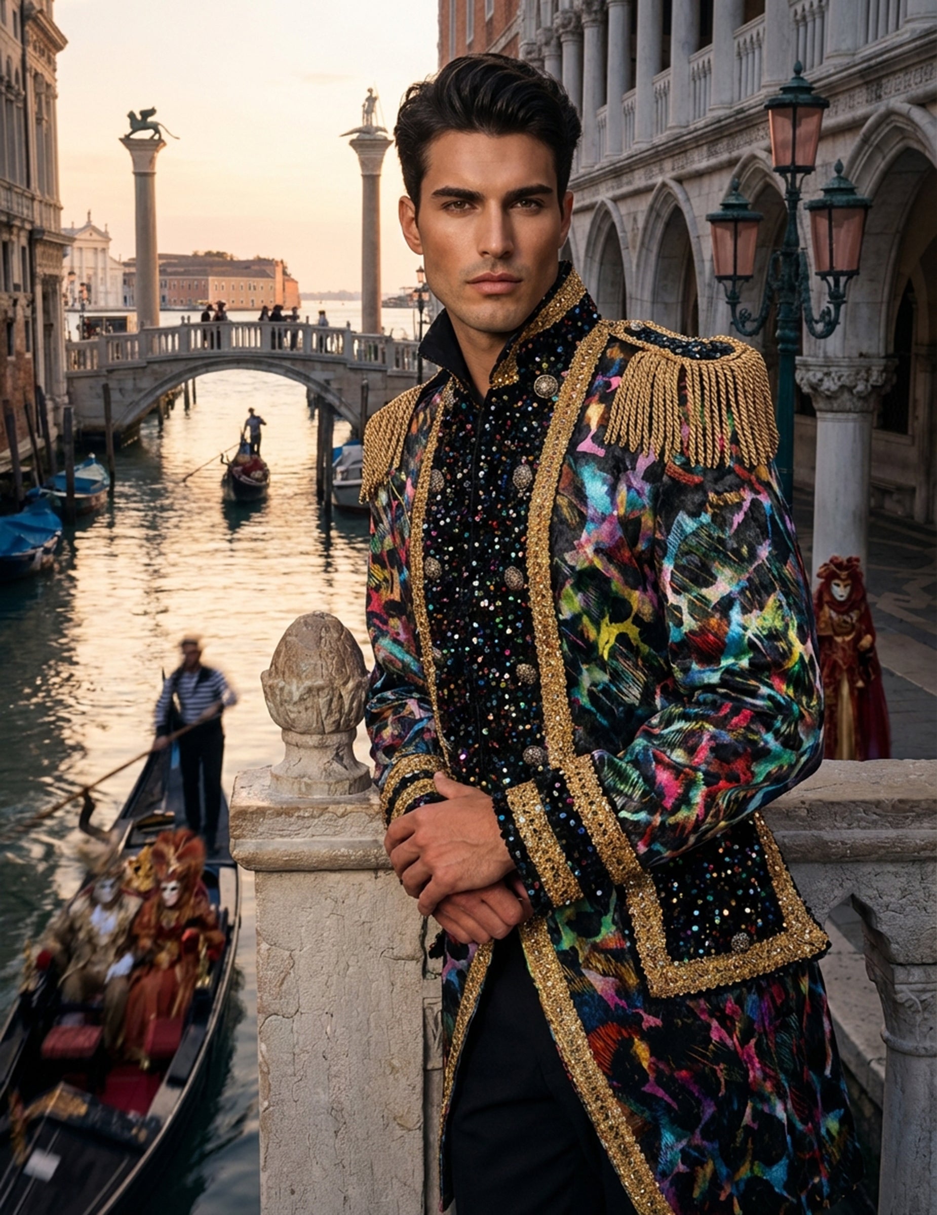 Ez a prémium minőségű férfi karneváli dzseki élénk neon színekben, intenzív árnyalataival és arany díszítésével tűnik ki, fokozva ünnepi megjelenését. A rojtos váll-lapok meghatározzák a sziluettet, míg a csillogó csíkok és a többszínű minták energiát adnak. Az összhatás a mozgást hangsúlyozza, és feltűnő jelenlétet kölcsönöz, ideális egy merész öltözék kiegészítésére. Tökéletes karneválra vagy jelmezbálra, könnyedén kiegészíti a stílusos kitűnésre törekvő megjelenést.