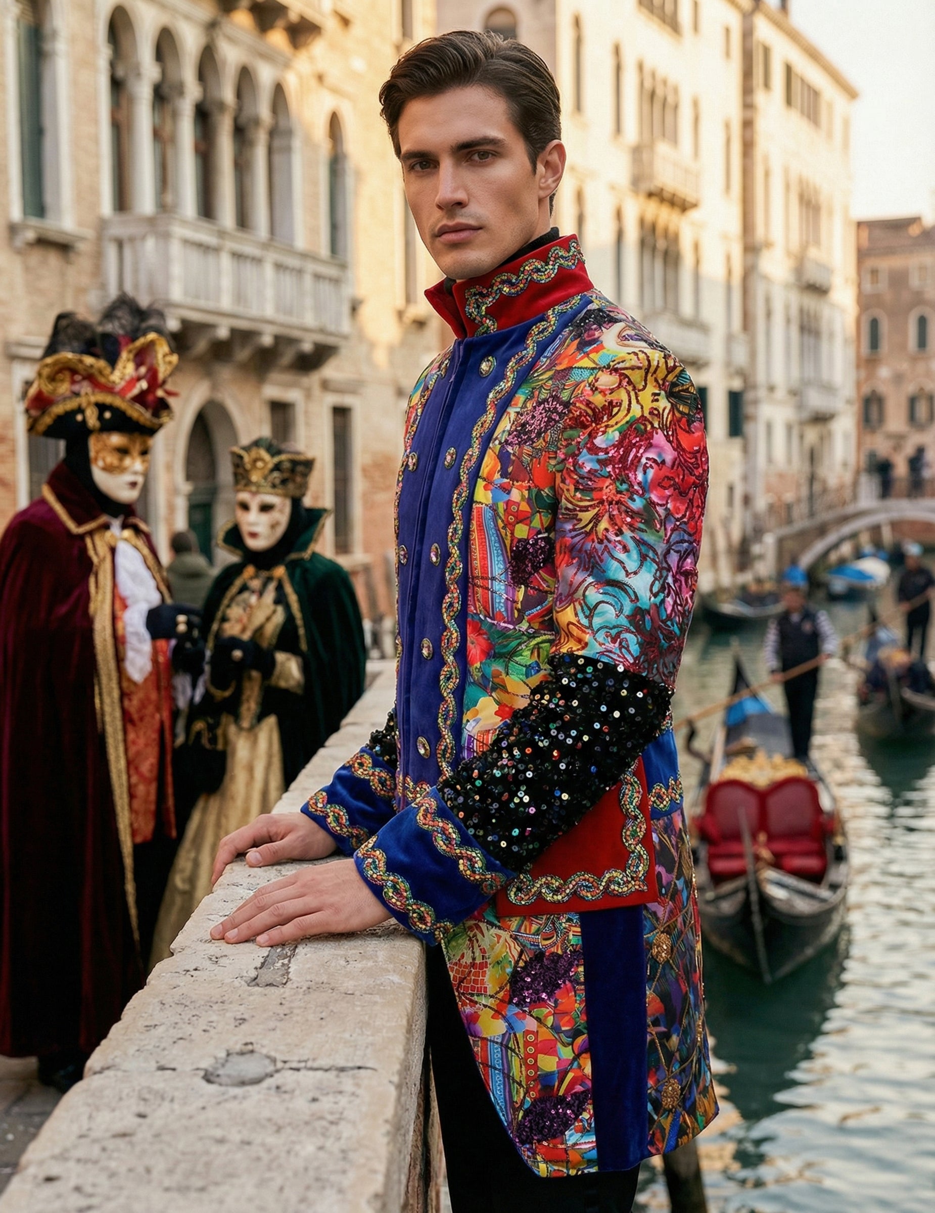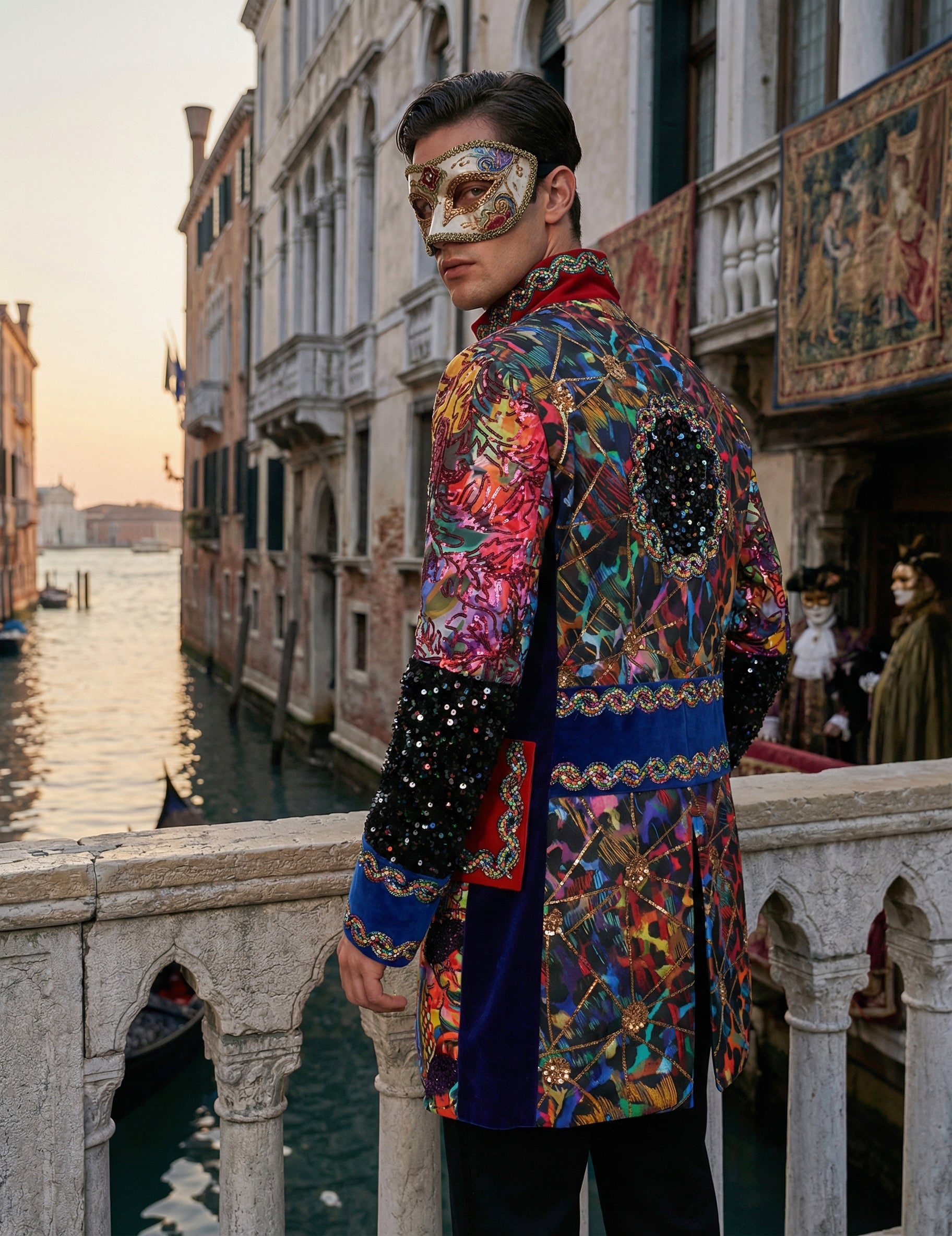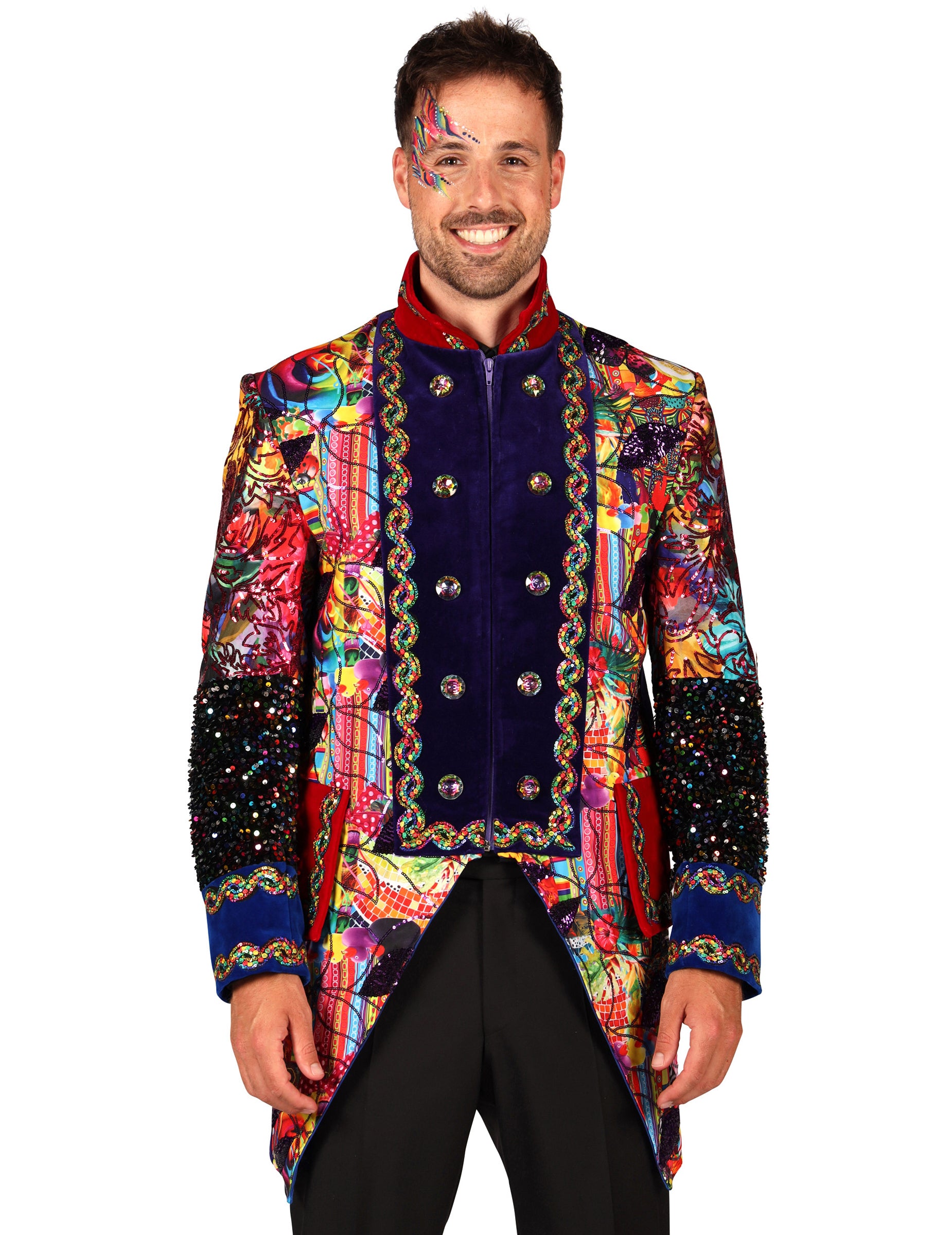 Ez a prémium minőségű, színes Fiesta Carnavale stílusú férfi karneváli zakó azonnal kitűnik élénk színeivel és dekoratív mintáival, amelyek ünnepi hangulatot kölcsönöznek neki. A díszített ujjak, a sorban elhelyezett gombok és a kontrasztos kidolgozások strukturált megjelenést biztosítanak, míg a sokszínű részletek energikus hatást keltenek. A látvány kiemeli az alakot és erőteljes megjelenést ad, tökéletes egy igazán kifejező jelmezhez.