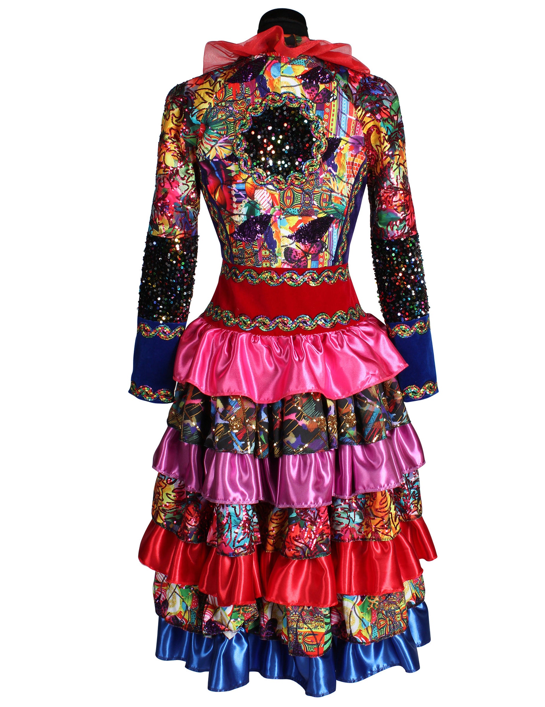 A fonott és flitterrel díszített ujjak, a piros fodros díszítésű gallér és a kontrasztos minták ünnepi és karakteres összeállítást alkotnak!