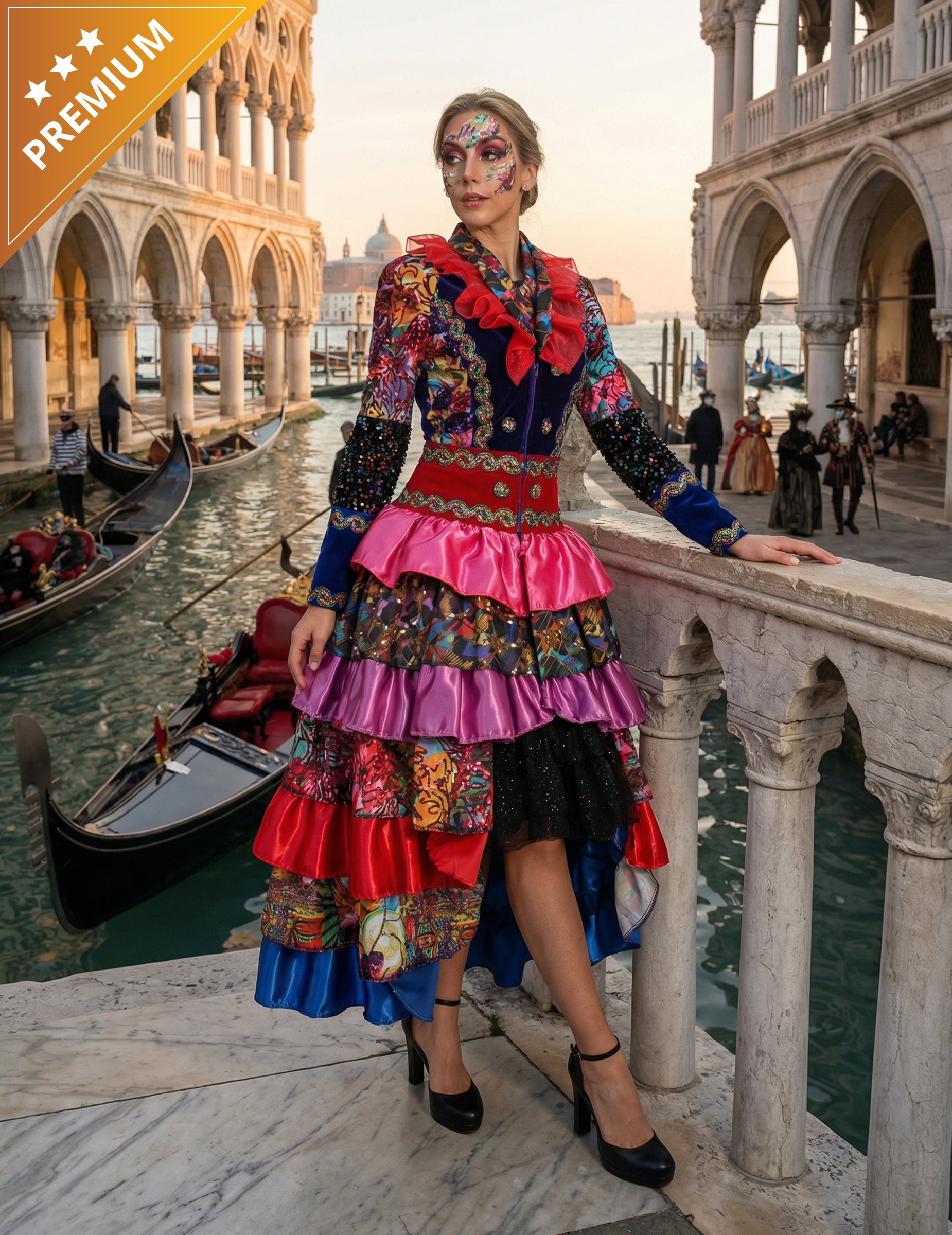 Ez a vLuxus női hosszú karneváli ruha Intenzív, többszínű árnyalatai, aprólékos kidolgozása és ünnepi mintái vonzzák a tekintetet.