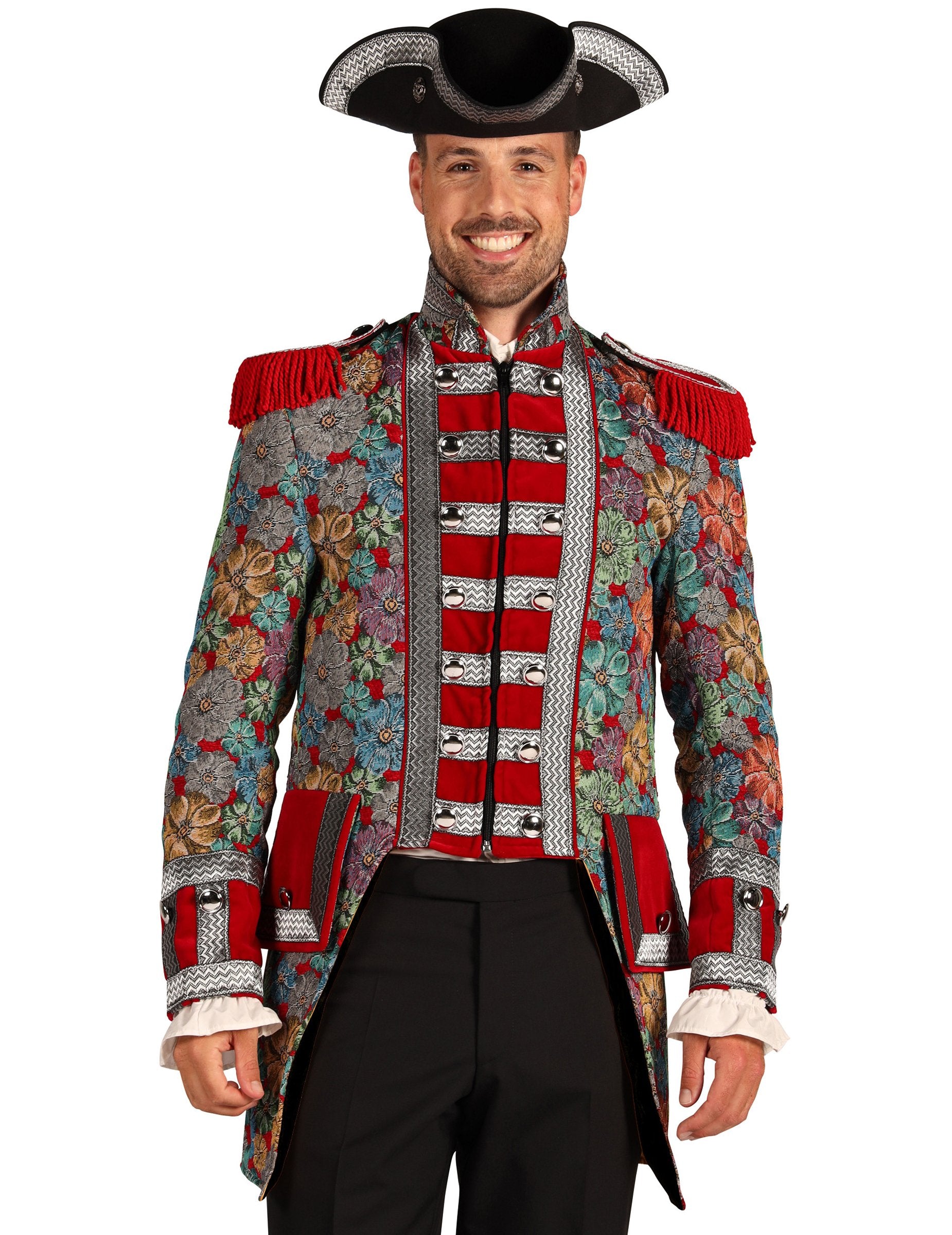 Ez a prémium minőségű, virágos mintás férfi karneváli dzseki élénk színeinek és bonyolult virágmintáinak köszönhetően gazdag vizuális vonzerővel büszkélkedhet. A piros váll-lapok strukturált sziluettet alkotnak, míg a díszítő részletek elegáns megjelenést kölcsönöznek. A kontrasztos csíkok kiemelik a kabát formáját, és minden mozdulattal kifinomultságot kölcsönöznek. Tökéletes karneváli vagy jelmezbáli viseletre, stílusosan kiegészít minden kitűnni vágyó öltözéket.