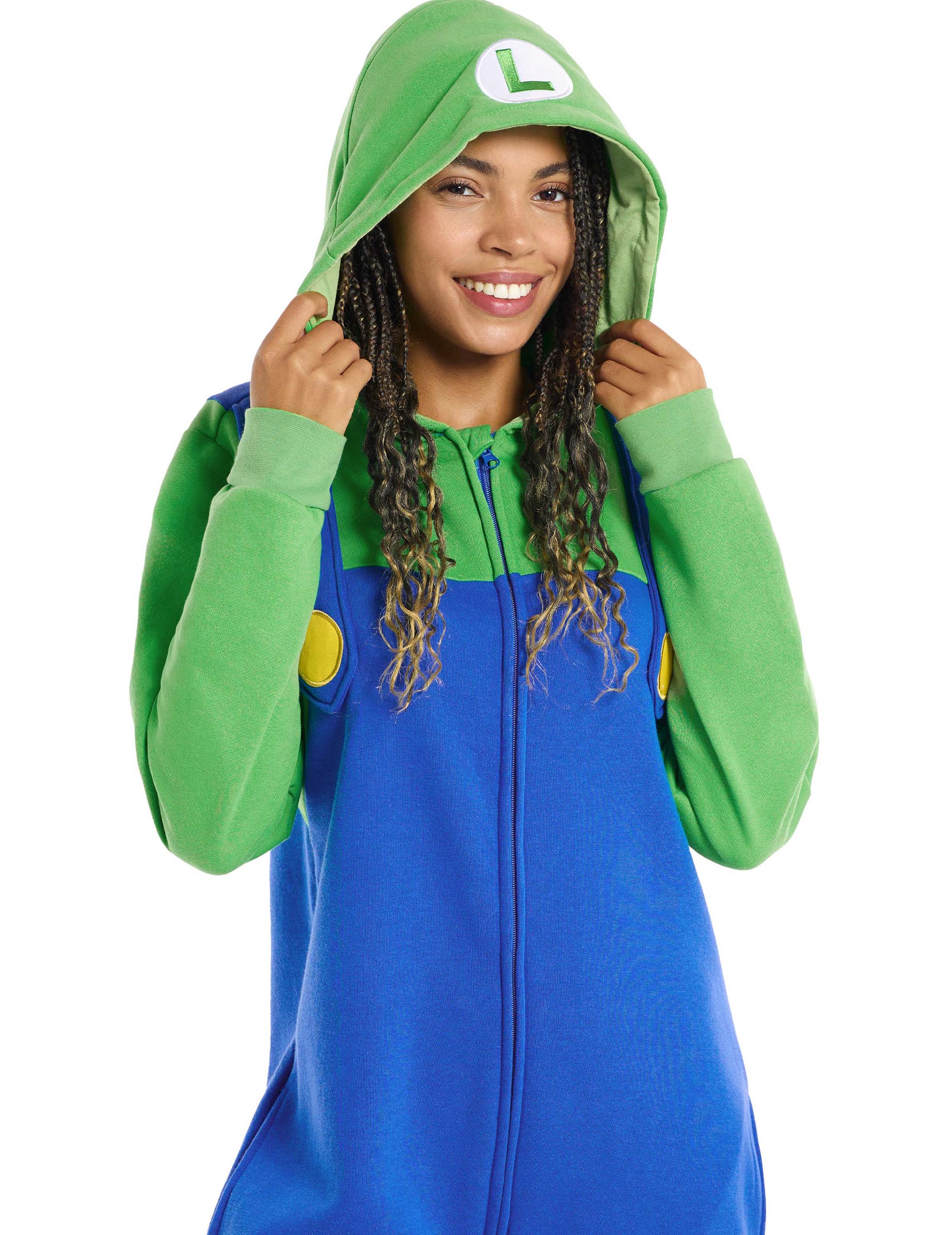 Ez a felnőtt Luigi™ kezeslábas a karakter ikonikus színeit idézi: zöld kapucnis felső és kék, kertésznadrágot utánzó alsó, így azonnal felismerhető megjelenést kölcsönöz.