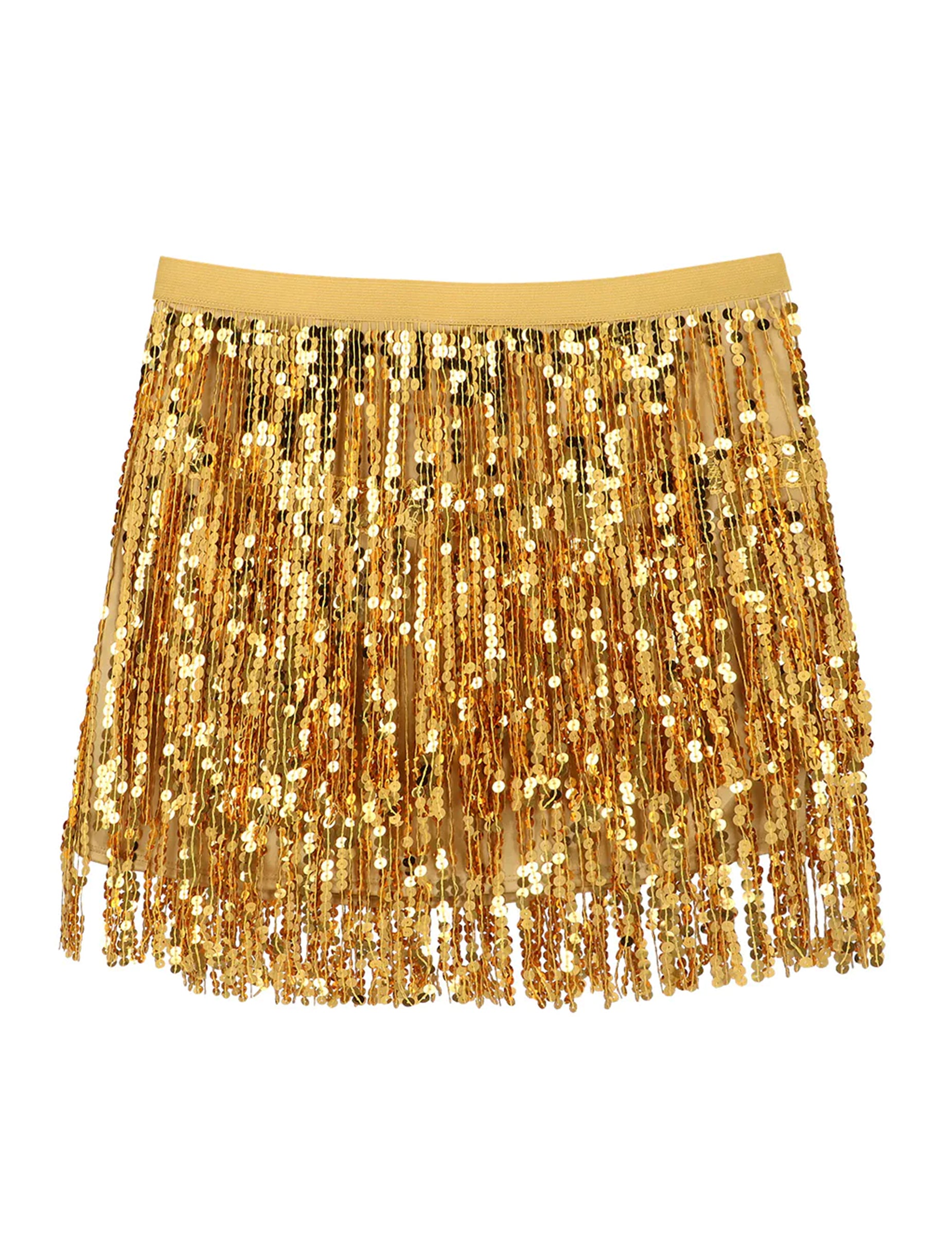 Ez az arany flitteres miniszoknya nőknek hosszú, csillogó rojtjaival tűnik ki, amelyek minden lépésnél elegánsan mozognak.