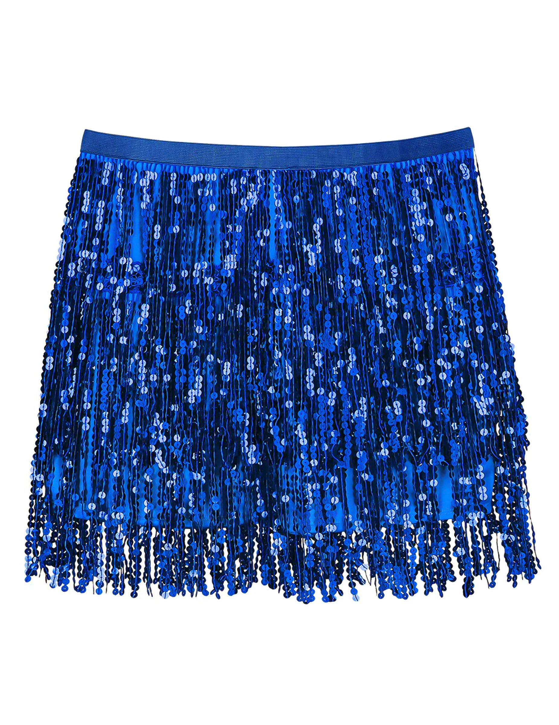 Ez a kék, flitteres miniszoknya nőknek mély színével és fényt visszaverő flittereivel tűnik ki. Rövid szabása kiemeli az alakot, míg a dekoratív rojtok nagyon kifejező, táncos hatást keltenek. Az összhatás ünnepi és lendületes hangulatot ad, ideális egy esti buli jelmezének kiegészítésére. Tökéletes választás bulira, születésnapra vagy bármilyen eseményre, ahol csillogó, színes megjelenést szeretnénk.