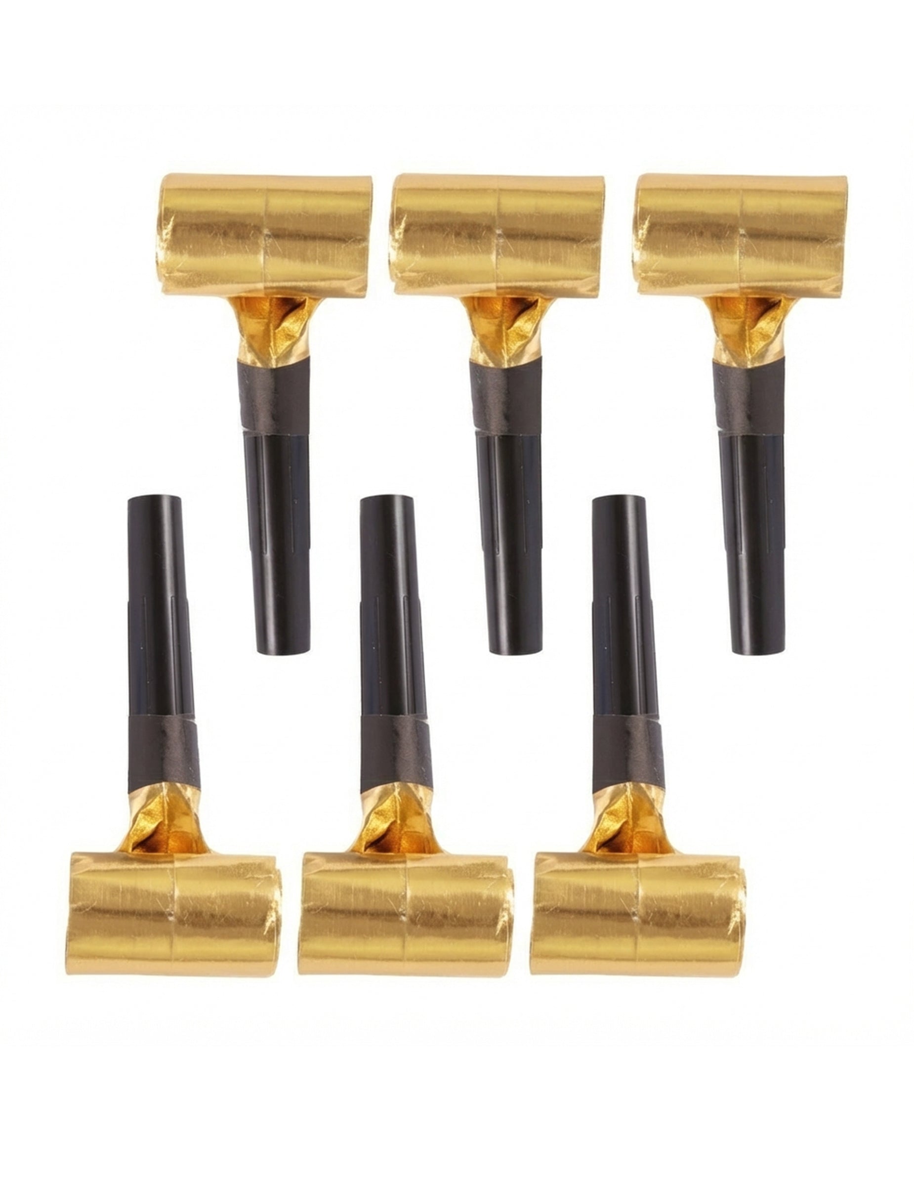 A 6 fekete és arany színű trombita vidám hangulatot teremt egymáshoz illő árnyalataival. Egyszerű kialakításuknak köszönhetően könnyen használhatók, hogy egy kis mókás hangulatot vigyenek az estébe. A fekete és arany keveréke tökéletesen illik egy elegáns parti dekorációhoz, és igényes hatást kelt. Tökéletes választás születésnapra, szilveszterre vagy bármilyen ünnepi eseményre.