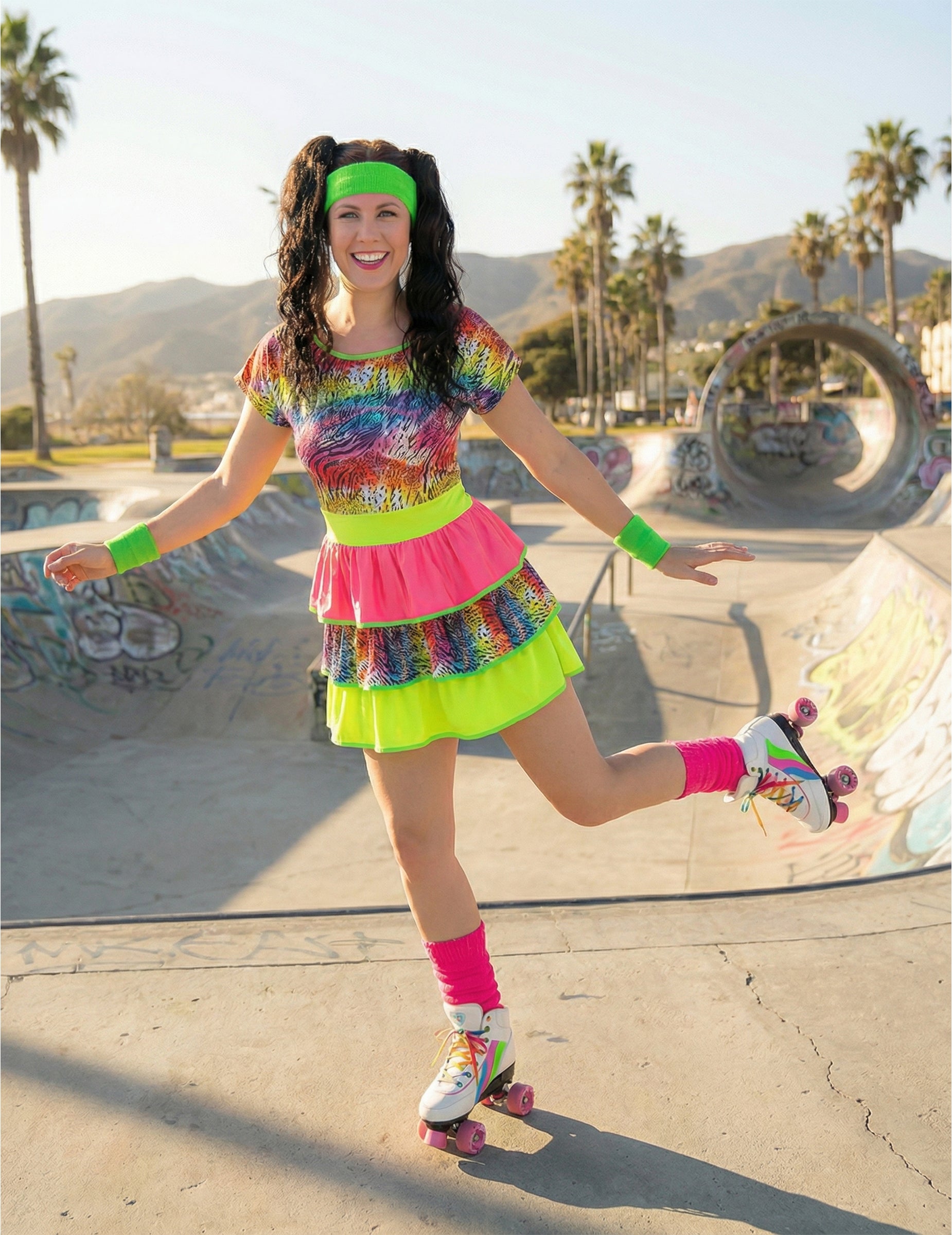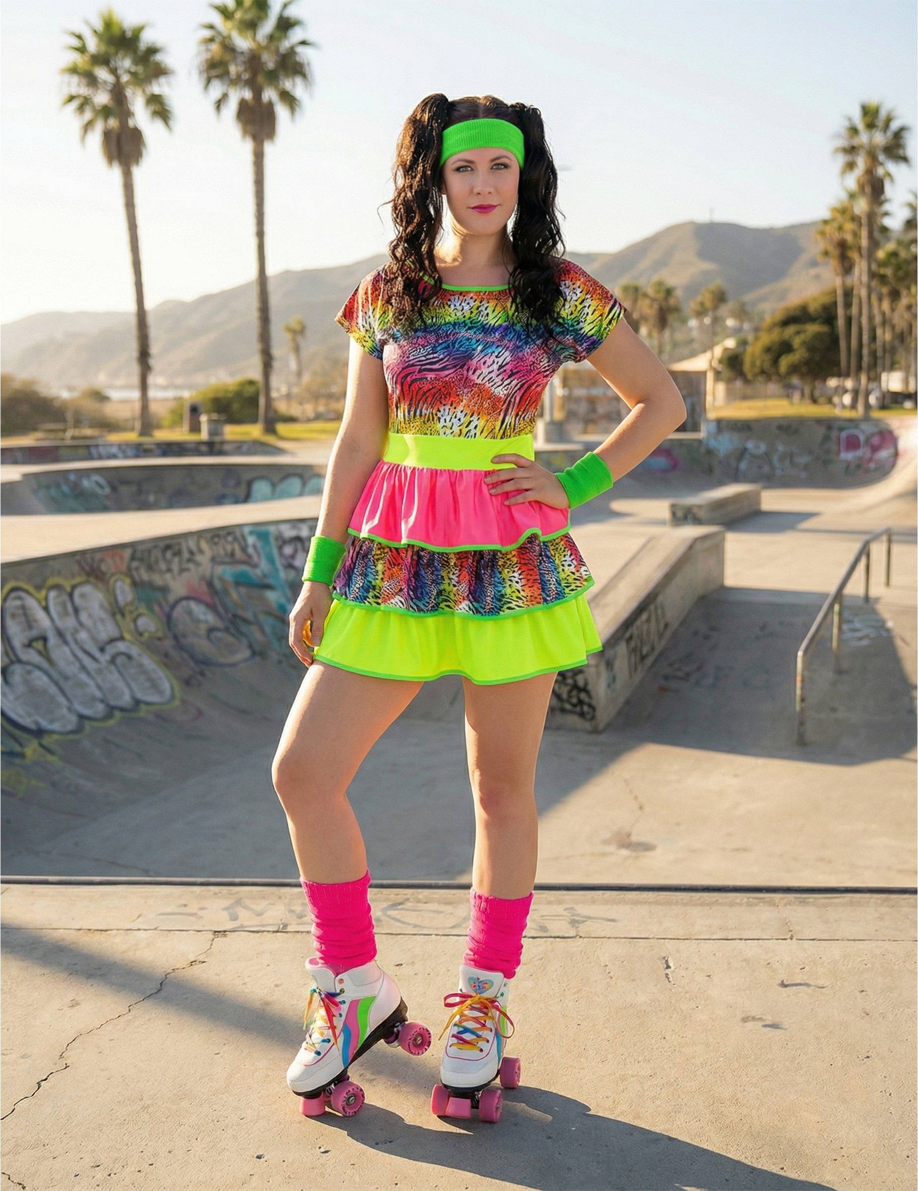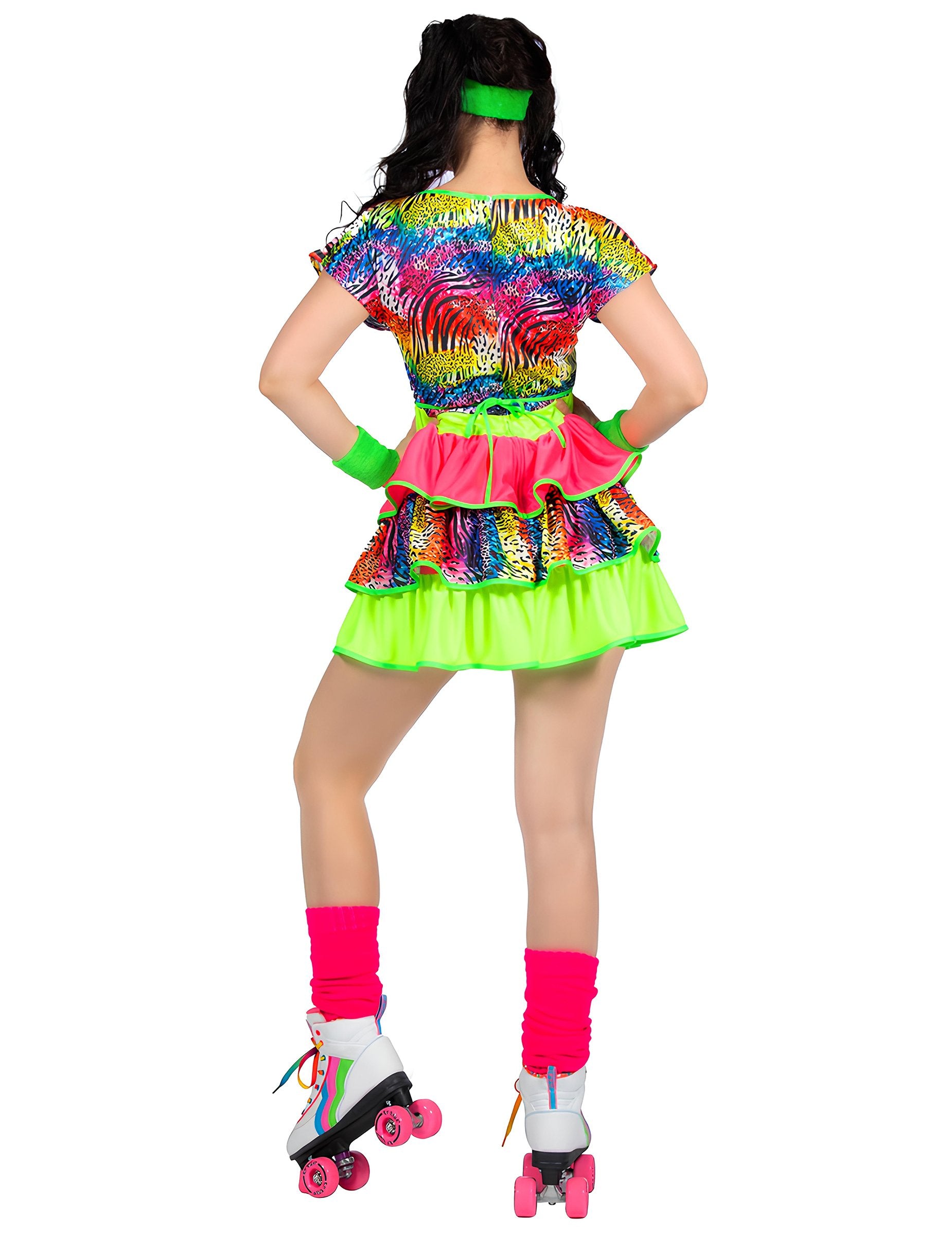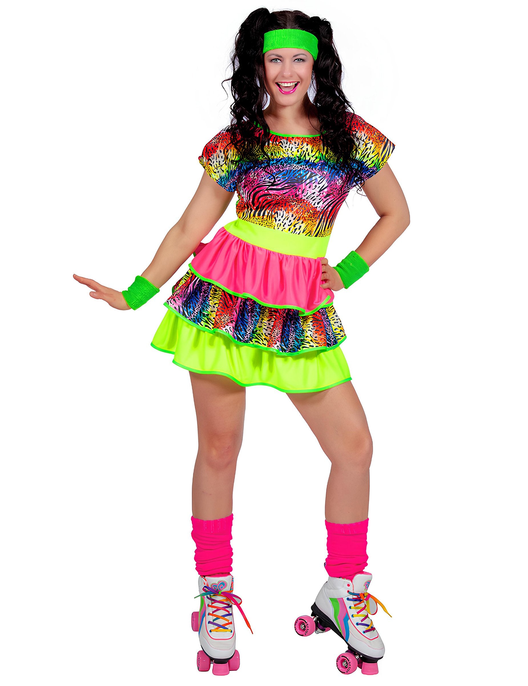 Ez a női, 80-as évek stílusú, giccses jelmez egy élénk színű ruhát mutat be, amelyben többszínű minták és neon árnyalatok keverednek. A rövid fazon, a többrétegű fodrokkal együtt, visszaidézi ennek a színpompás évtizednek a vidám és túlzó stílusát. A neon színek és a minták keveréke energikus, tipikusan retró hatást kelt anélkül, hogy túlzásba esne, miközben könnyed és szórakoztató megjelenést biztosít. Tökéletes választás egy 80-as évek bulira, farsangra vagy retró eseményre, ahol ez a ruha élénk hangulatot visz, és még vidámabbá, lendületesebbé és kényelmesebbé teszi a megjelenésedet.