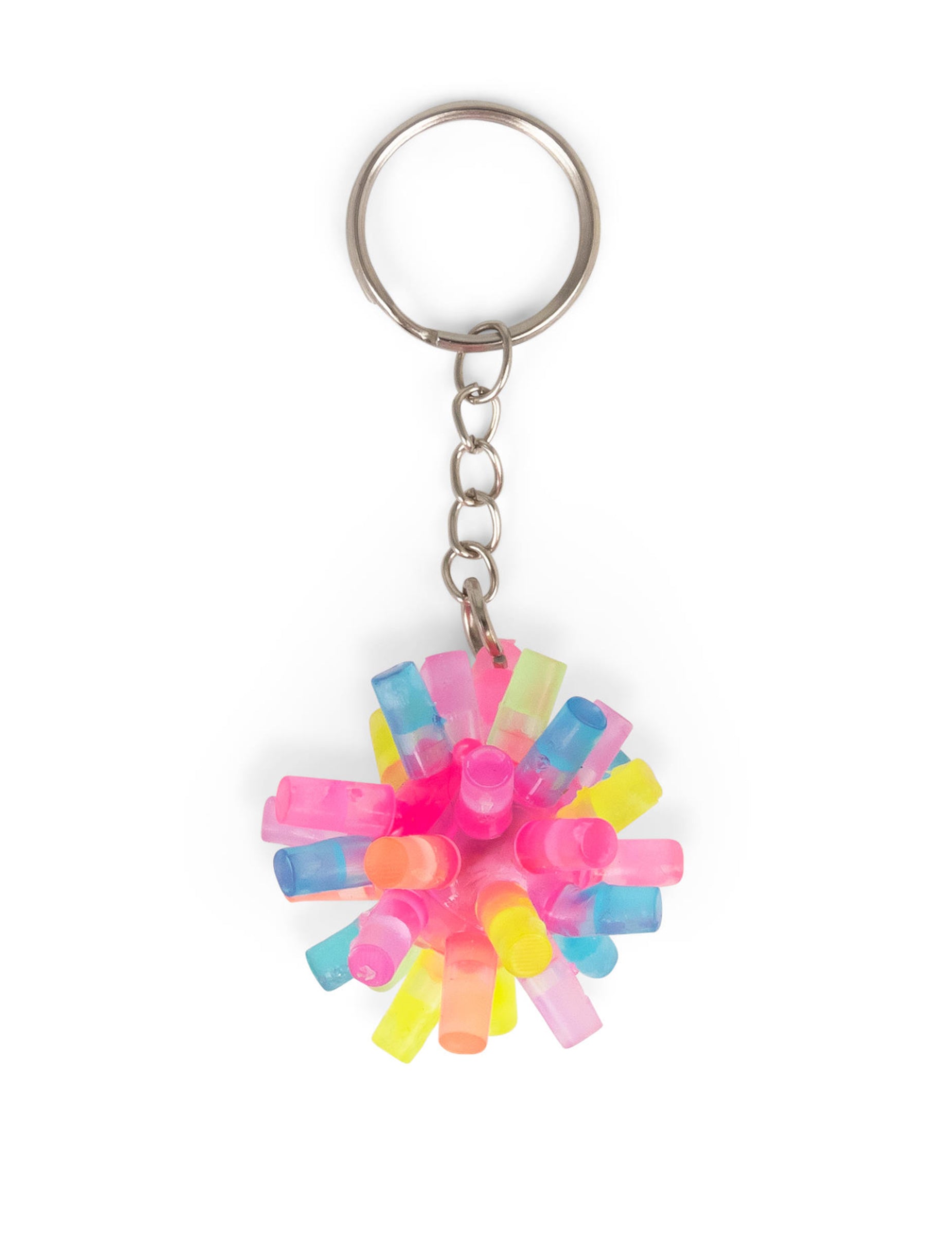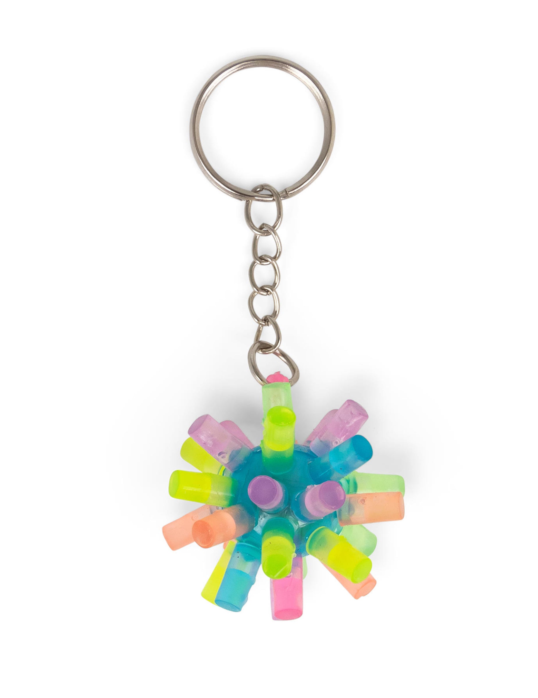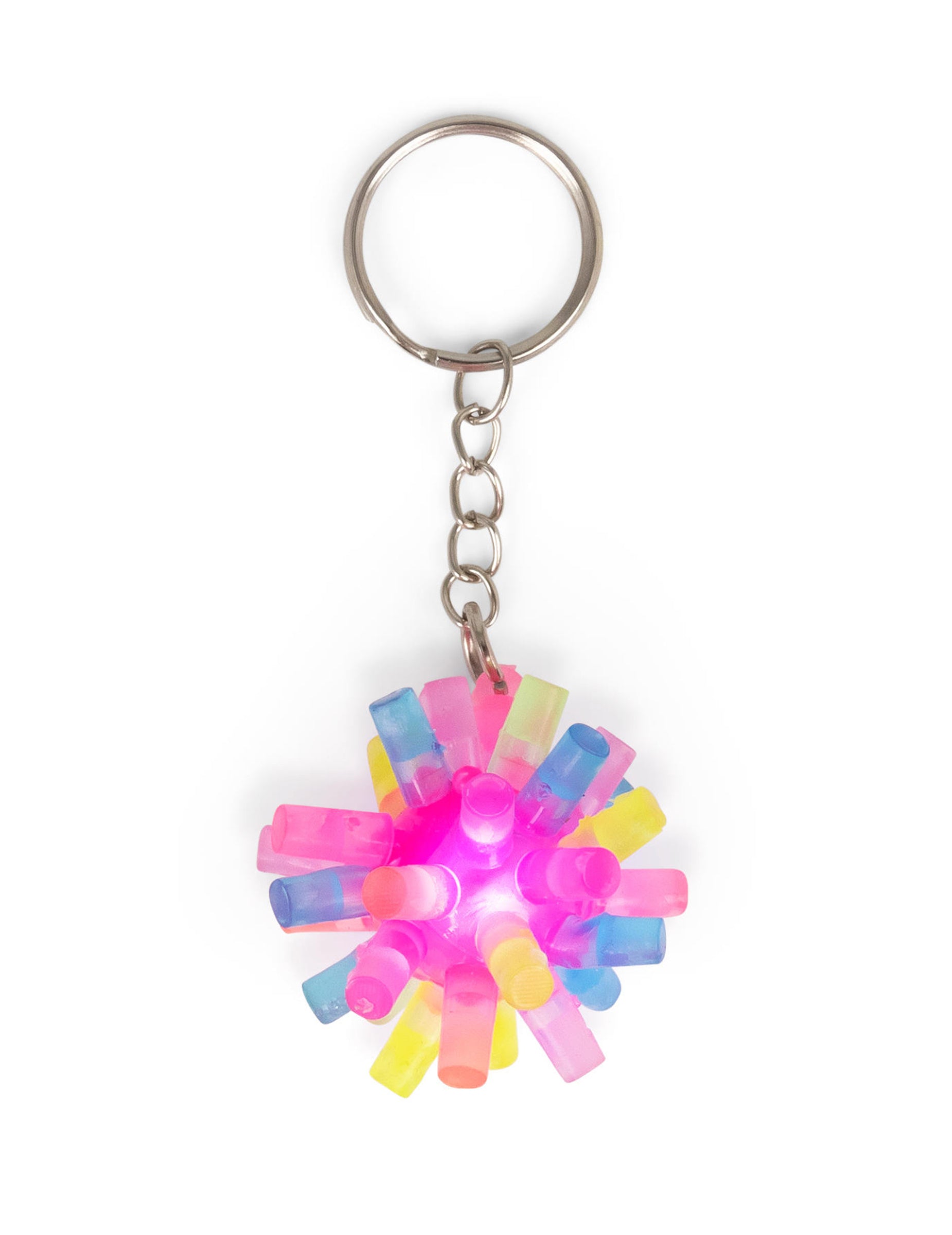 A élénk színű, tüskés kulcstartó egy kicsi, színes kiegészítő, amely egy áttetsző dudorokkal ellátott puha labdából áll, amely kézbevételkor világít.