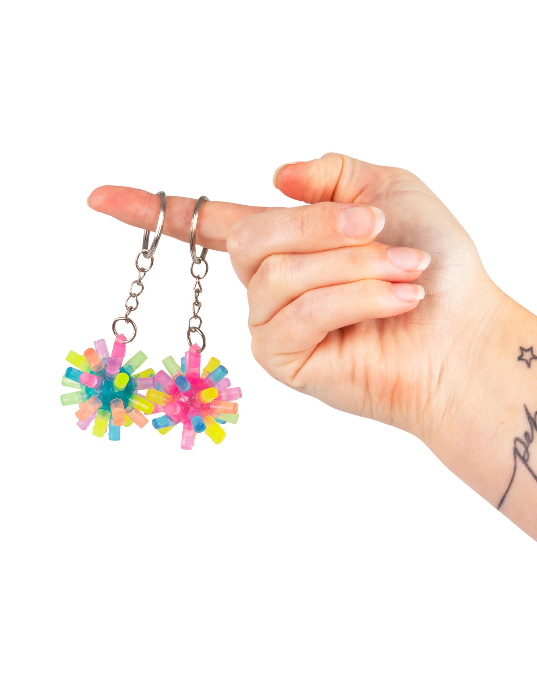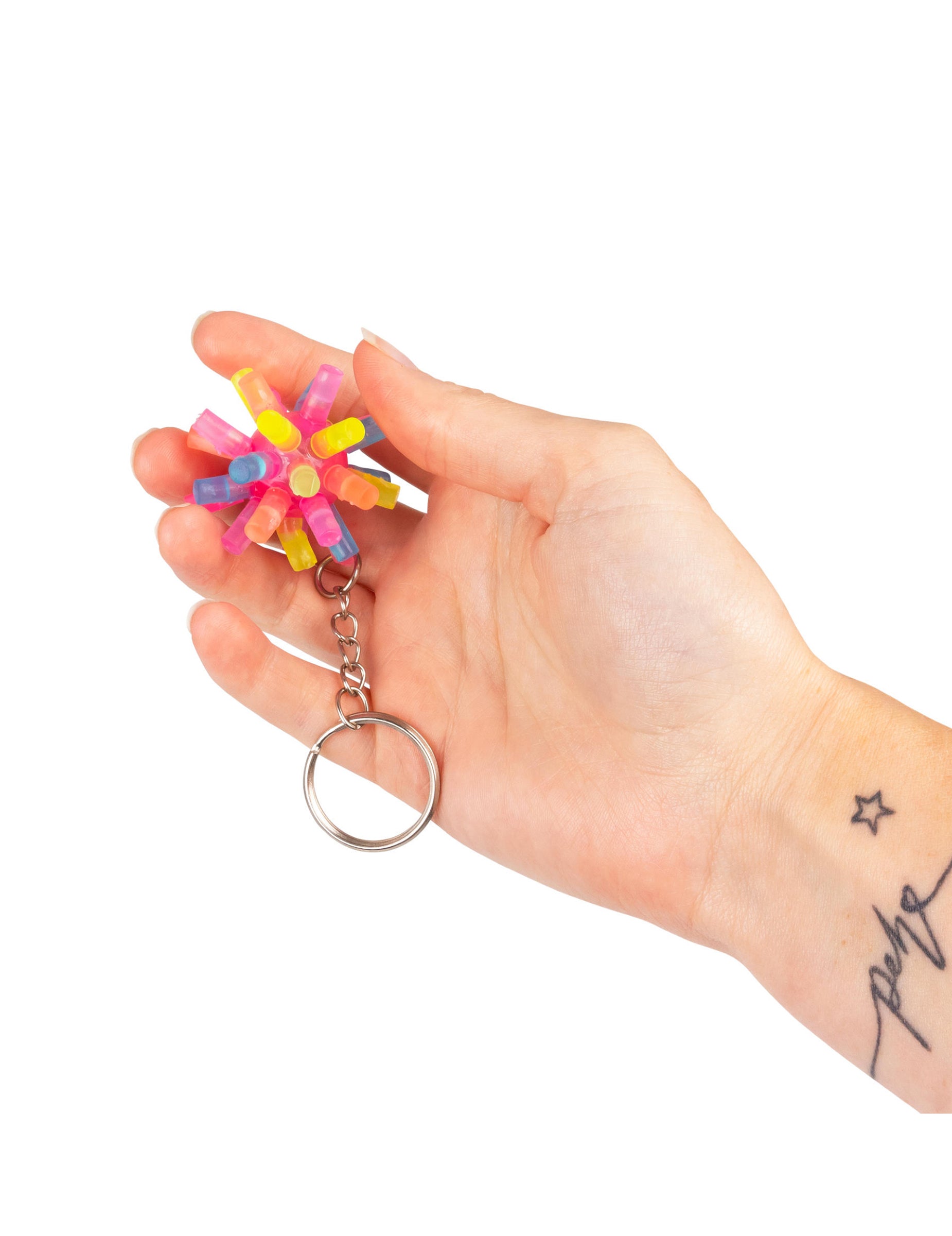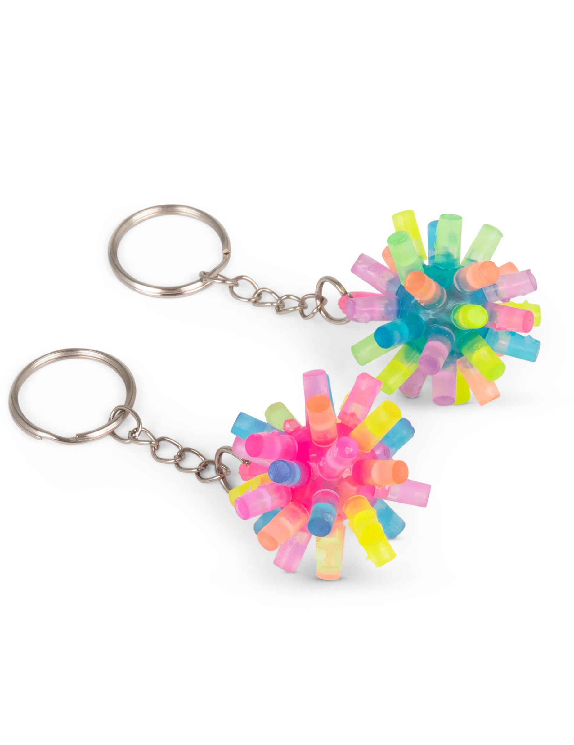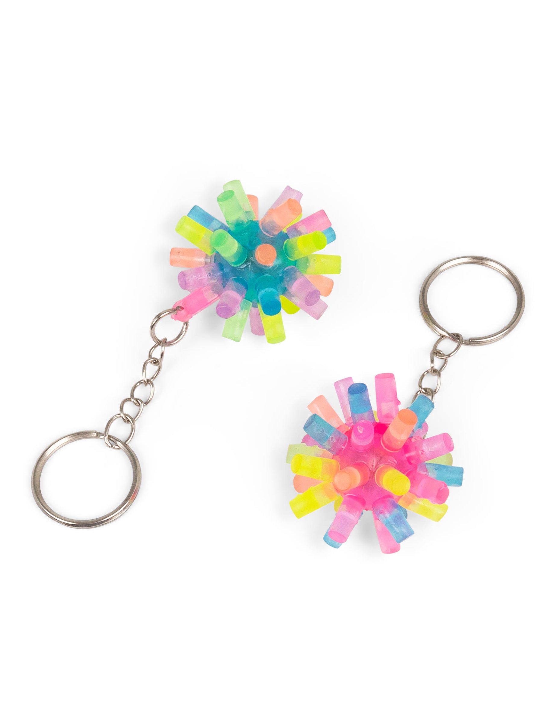 A élénk színű, tüskés kulcstartó egy kicsi, színes kiegészítő, amely egy áttetsző dudorokkal ellátott puha labdából áll, amely kézbevételkor világít.