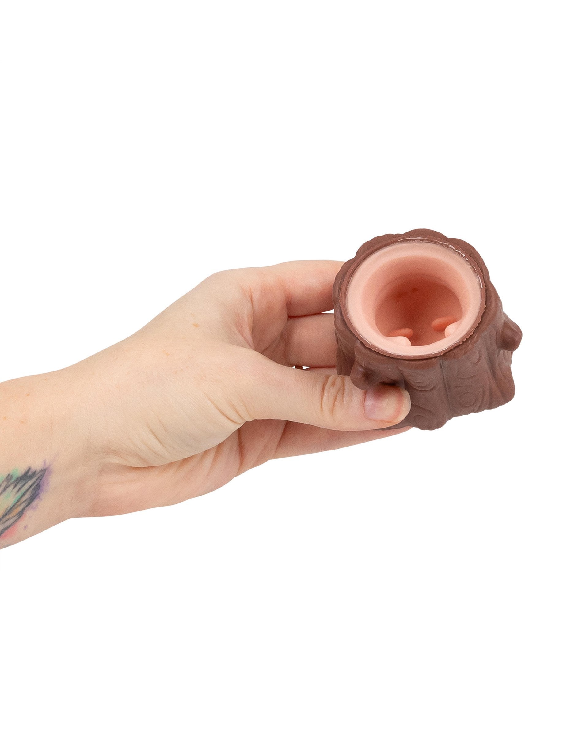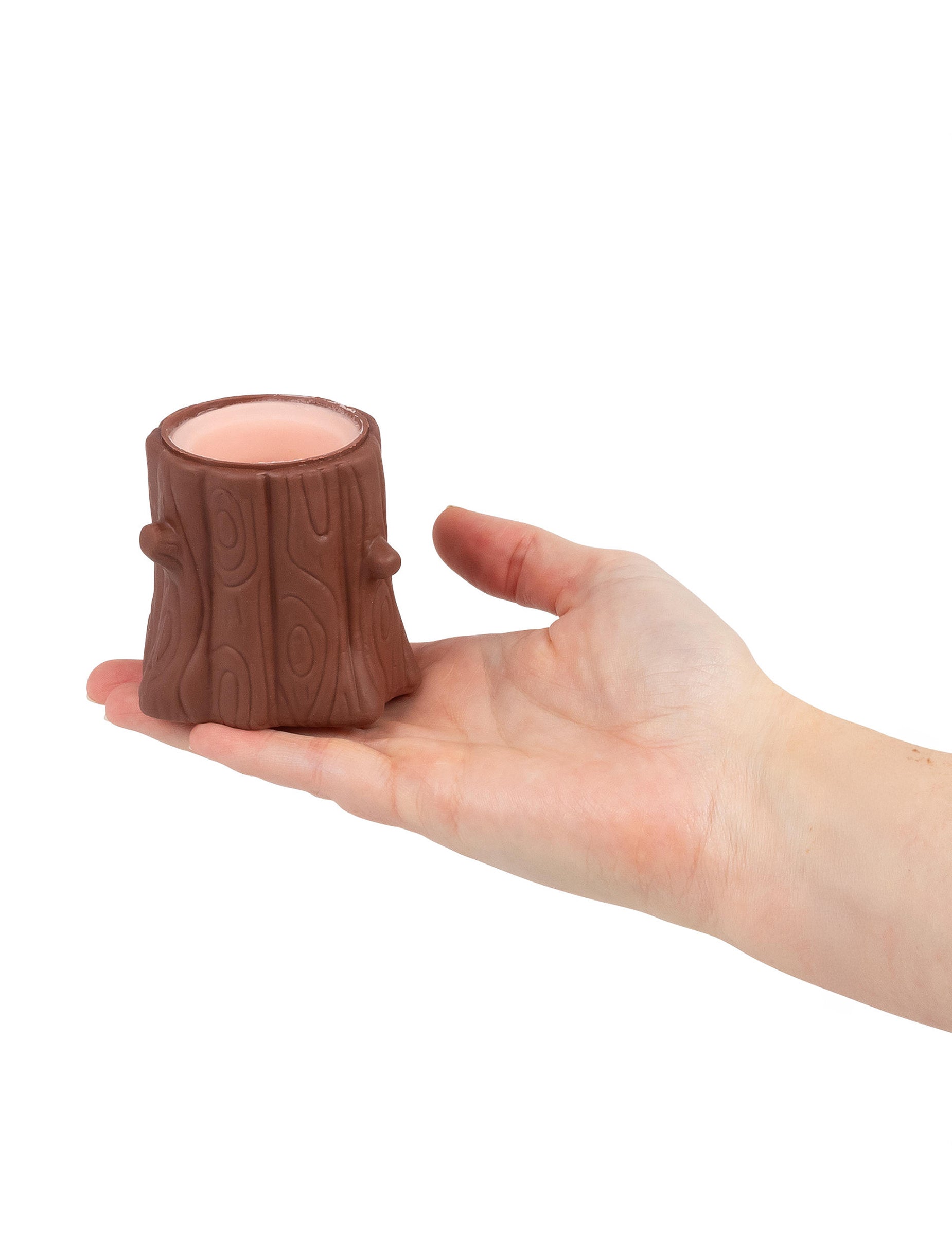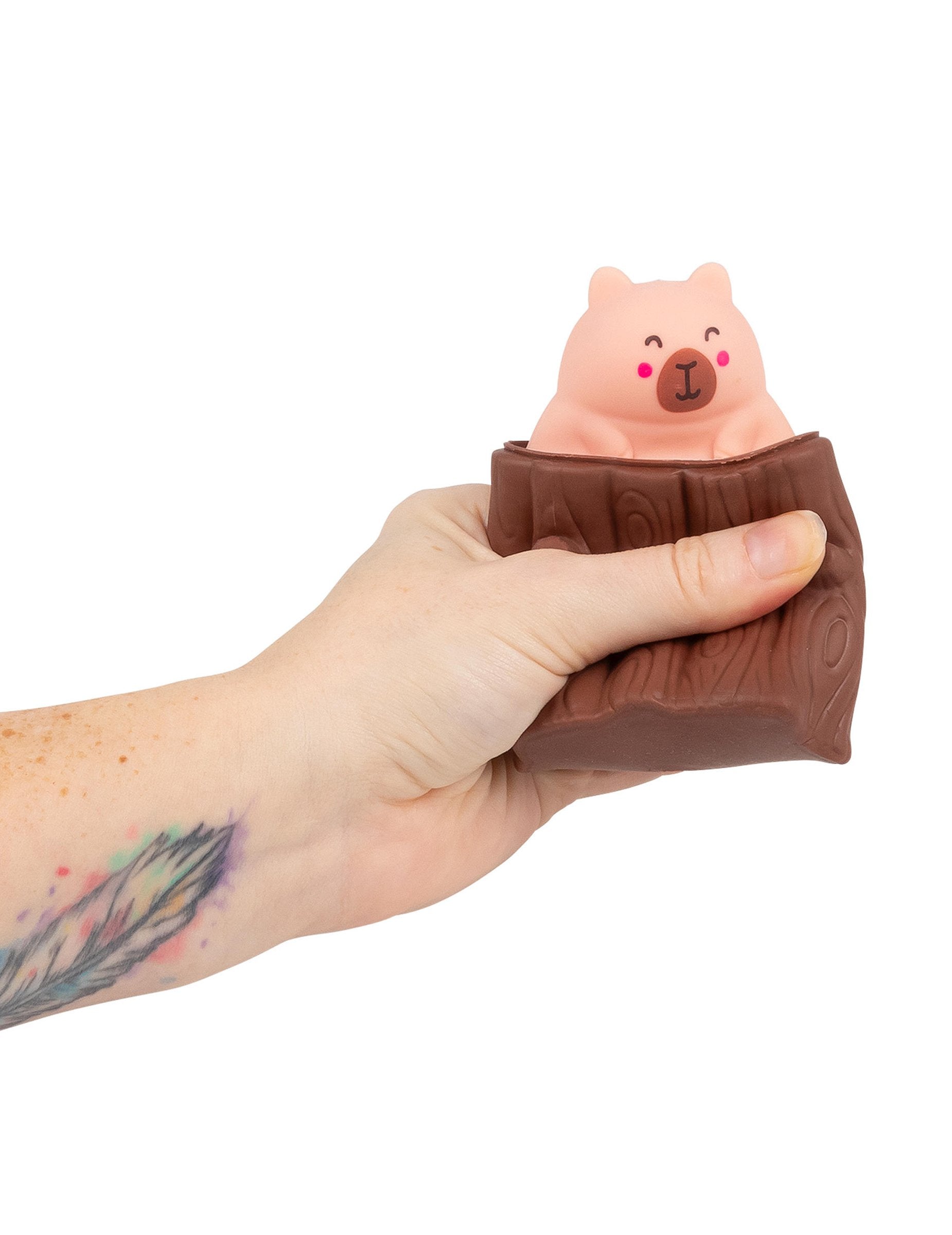 A barna alap egy fatörzs vagy búvóhely formáját idézi, puha textúrája pedig könnyen deformálódik az ujjak között. Minden egyes nyomásra a rózsaszín vízidisznó felemelkedik, majd a nyomás felengedésekor eltűnik, egyszerű és szórakoztató hatást keltve.