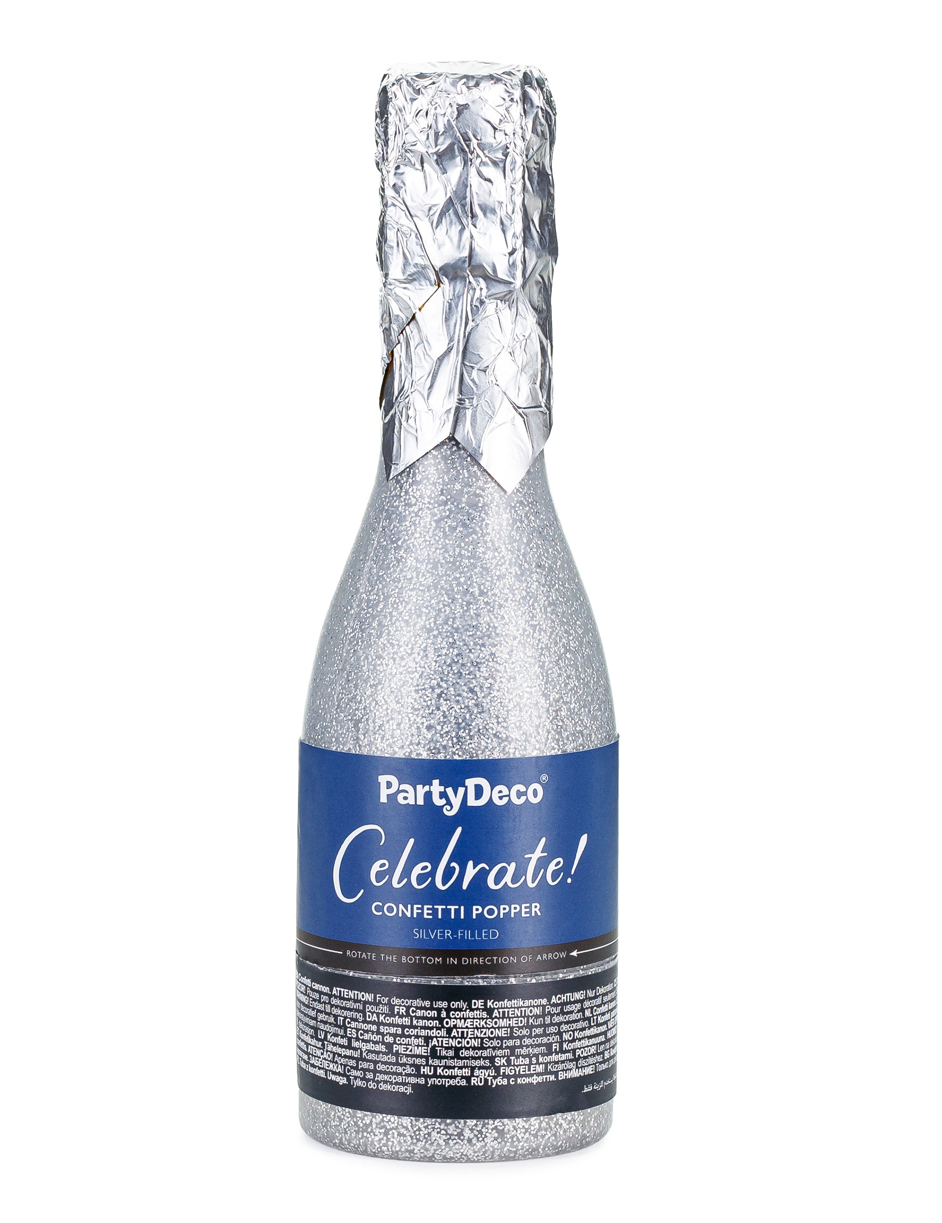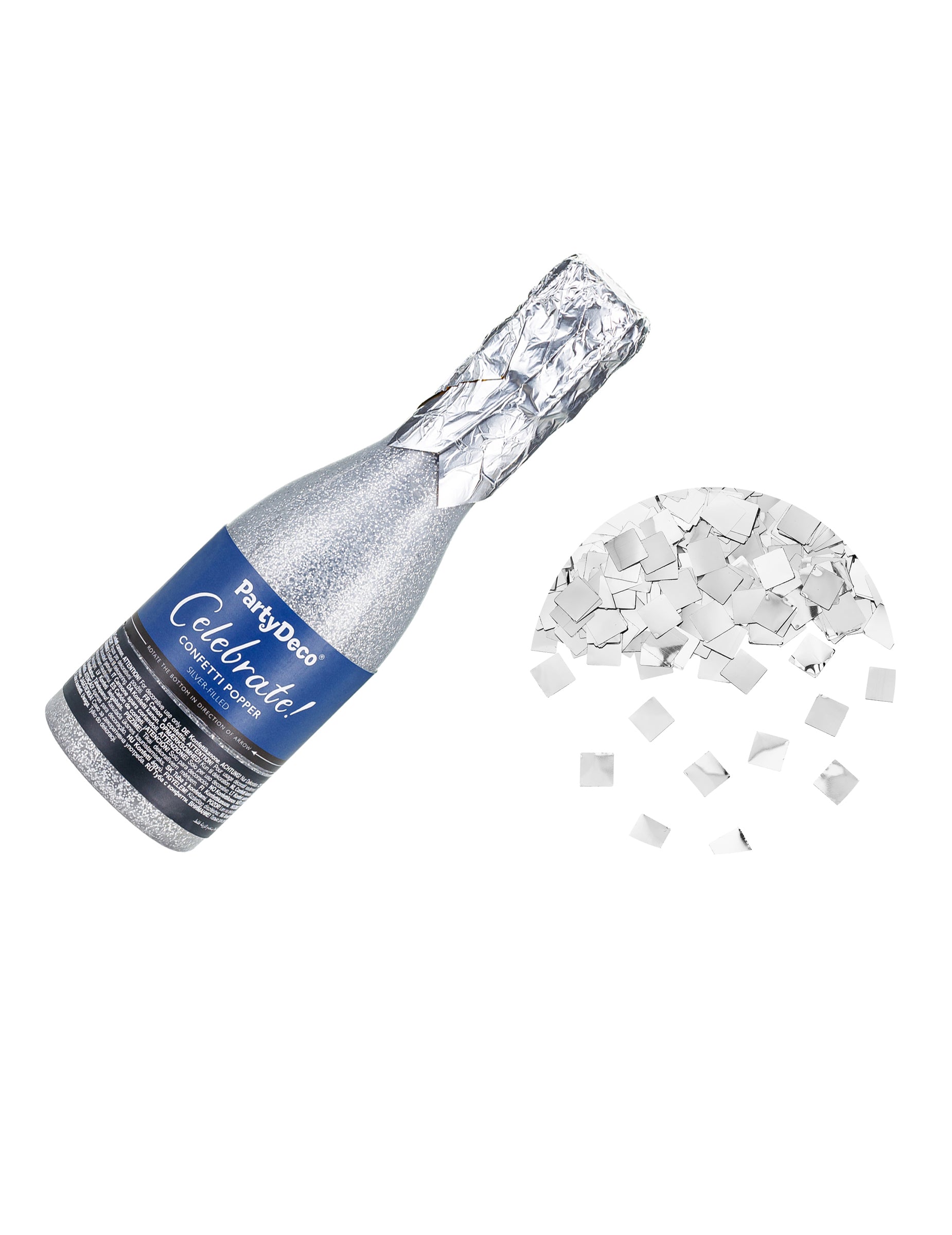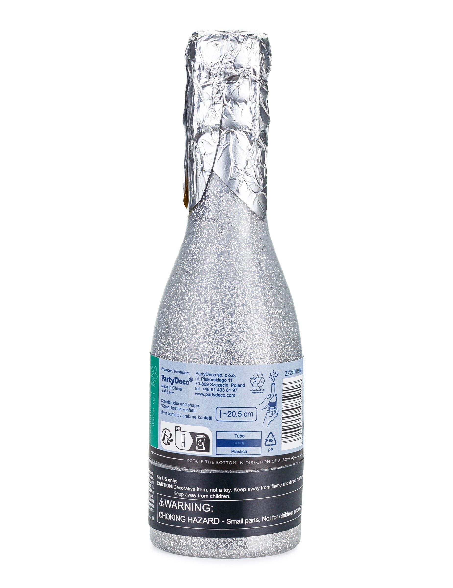 Ez az ezüst színű konfettiágyúpezsgősüveg formájú, és ezüst színű, fényes papírkonfettiket lő ki.