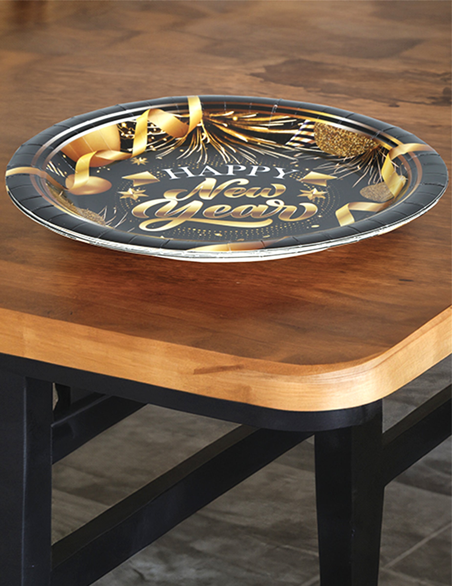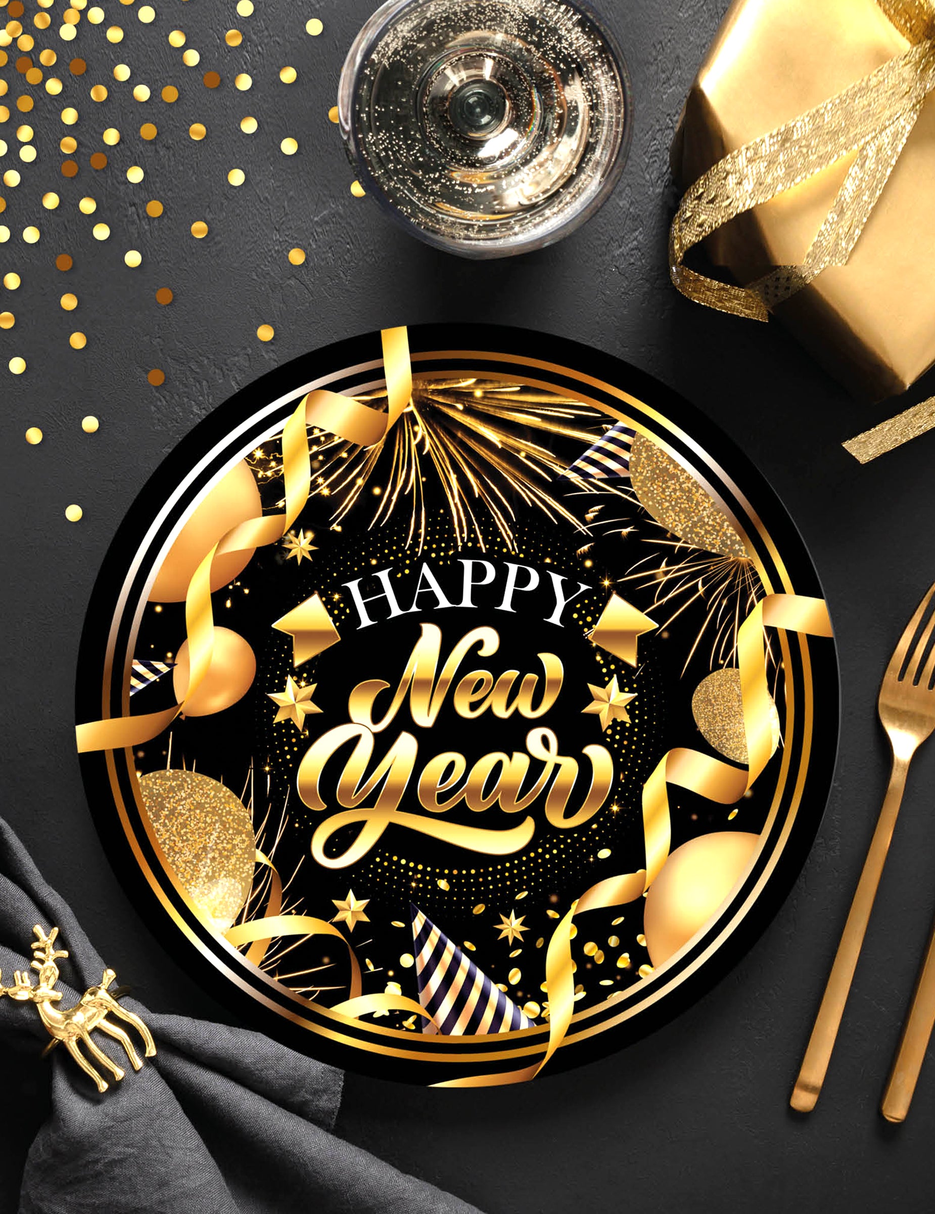 Ezek Újévi karton tányérok Fekete és arany dekorációt kínálnak, amely jól illik az ünnepi szezonhoz.