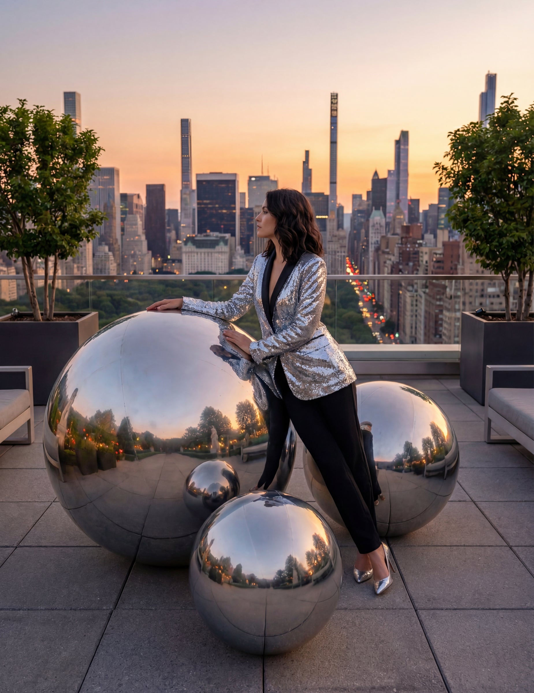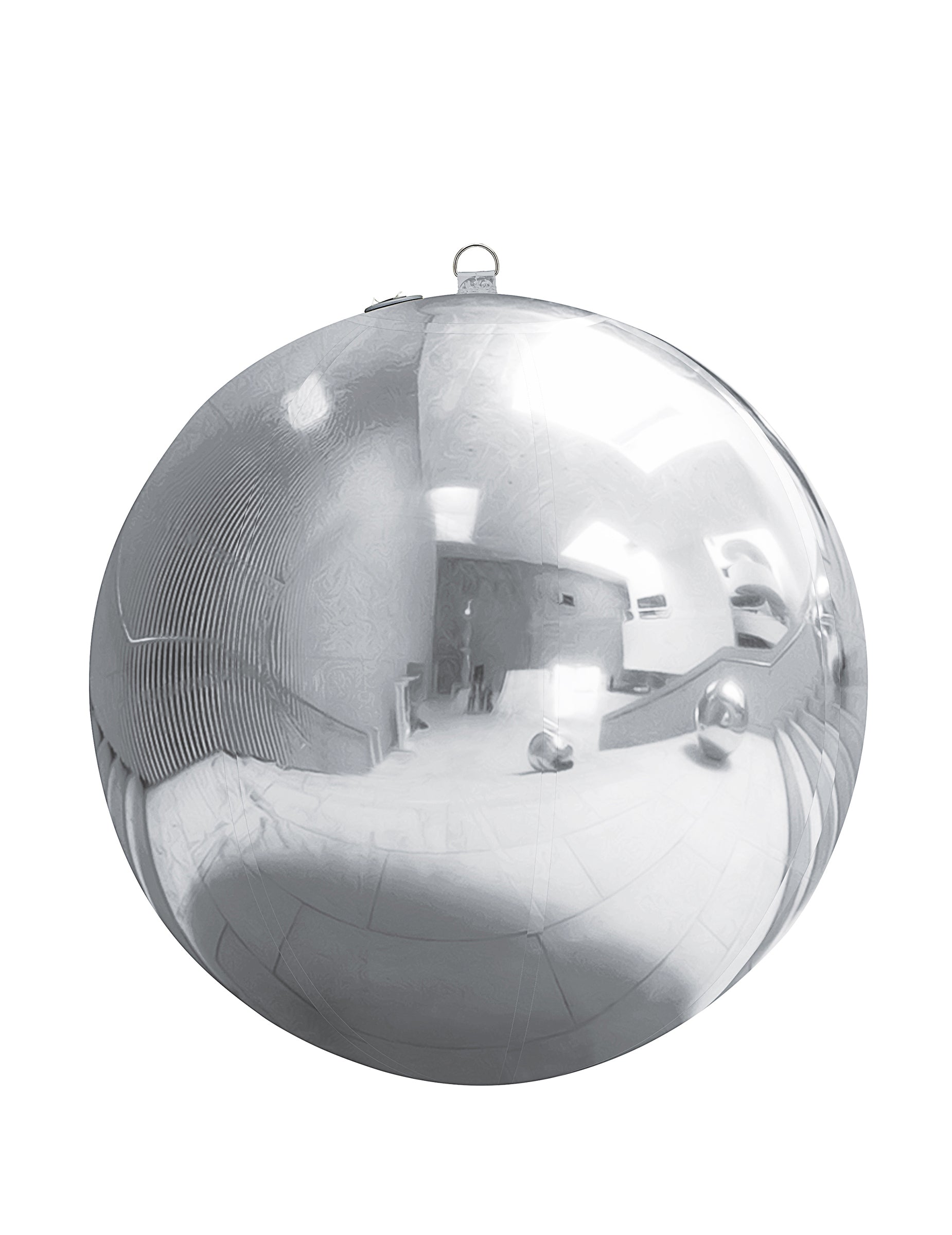 Ezüstös, tükörhatású felülete visszaveri a fényt és a környezetet. Gömb alakja és körülbelül 90 cm átmérője lehetővé teszi, hogy könnyedén elhelyezze egy teremben, fogadótérben vagy fotóháttér díszletben.
