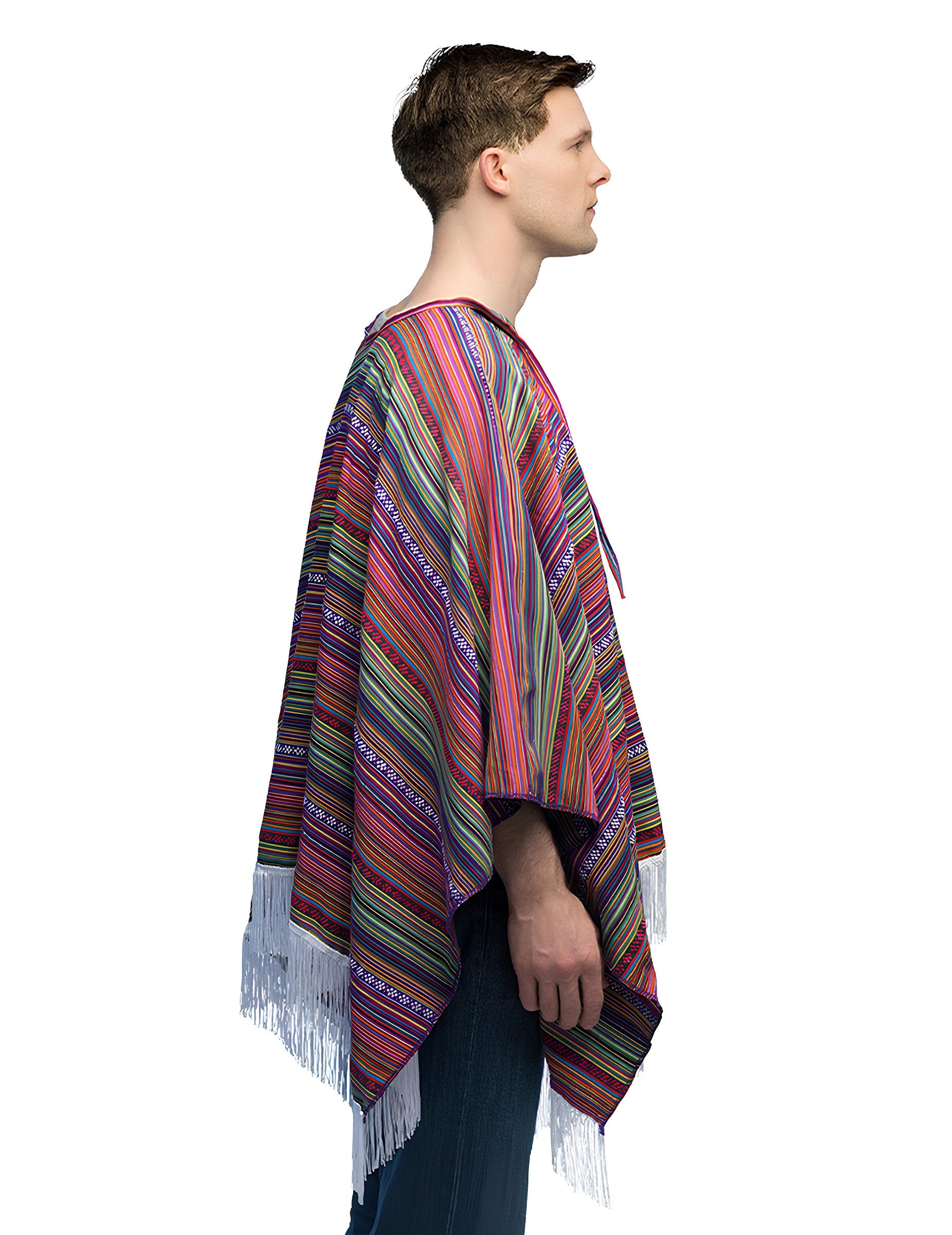 Ez a poncsó vízszintes, többszínű csíkokkal díszített, piros, zöld, sárga, kék és lila árnyalatokban. Laza fazonjának köszönhetően könnyen viselhető felső fölé, míg az alját világos színű, néhány centiméter hosszan lelógó rojtok díszítik. Az egyszerű, középre igazított nyakkivágás lehetővé teszi, hogy a poncsó simán omoljon a vállakra és a mellkasra.